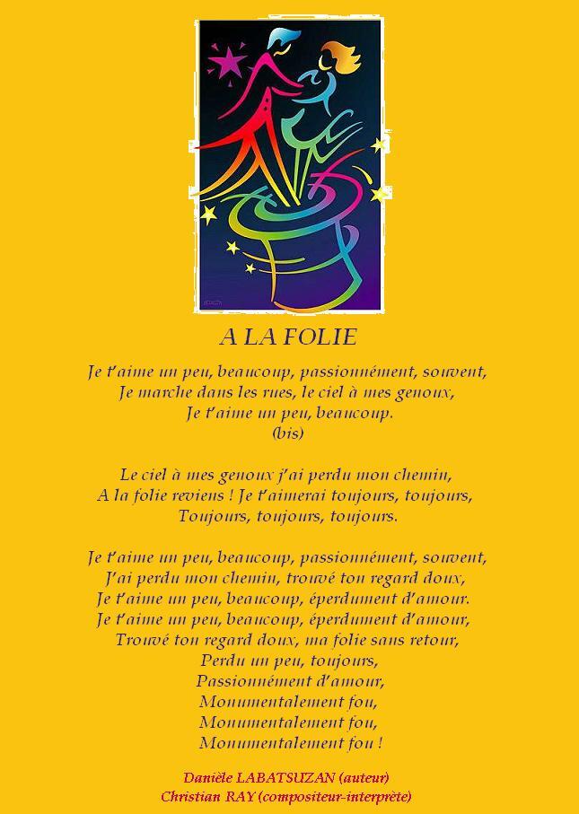 » A LA FOLIE » (chanson-guitare) Accueil › Vos poèmes ***UN SEUL PAR JOUR*** Les « poèmes » érotiques descriptifs ne sont pas les bienvenus... Ce sujet contient 4 réponses, 5 participants et a été mis à jour pour la dernière fois par NoireLune, le 05-11-2025 21:35. Vous lisez 4 fils de discussion Auteur Messages 5 novembre 2025 à 6h10 #3591818 Mascotte d'Oasis Marie-Thérèse H. Sujet: 1727Réponses: 26263 Bonjour Chris Ray, Pour écouter ta musique il faut que je l’enregistre sur mon ordinateur cela m’ennuie un peu pouquoi ne pas faire une musique à écouter si possible sans la télécharger ce n’est pas réalisable ? Merci de ta compréhension bonne journée en toute amitié Maria https://www.youtube.com/channel/UCpZt6YdLXLyMVA004T1KoiQ ... 5 novembre 2025 à 19h34 #3591890 Fran?ois Sujet: 300Réponses: 49951 Bonsoir Chris, magnifique chanson que propose la plume Amitiés La po?sie, c'est comme la cuisine, le mot faitout 00063312-1 5 novembre 2025 à 21h26 #3591909 SybillaMaître des clés Sujet: 5464Réponses: 79667 Bonsoir Cher Ami poète Christian, Magnifique déclaration d’amour et très belle chanson ! Belle soirée Cher Ami poète Christian ! Toutes mes amitiés Sybilla Le r?ve est le poumon de ma vie (Citation de Sybilla) 5 novembre 2025 à 21h35 #2723616 Mascotte d'Oasis christian Sujet: 6554Réponses: 13392 Pour écouter la chanson : CLIC ci-dessous… https://sd-1.archive-host.com/membres/playlist/2112031125/06Alafolie.wma Christian RAY avec Michel Drucker et Patrice Laffont 5 novembre 2025 à 21h35 #3591912 Mascotte d'Oasis NoireLune Sujet: 494Réponses: 20592 Agréable mélodie Une mélodie en duo Si je comprends bien La Po?sie ?a sert ? faire du bien... ?a d?noue le n?gatif... et ?a devrait ?tre rembours? par la s?curit? sociale... Auteur Messages Vous lisez 4 fils de discussion Vous devez être connecté pour répondre à ce sujet. Connexion Identifiant: Mot de passe: Rester connecté Connexion Log in / Register