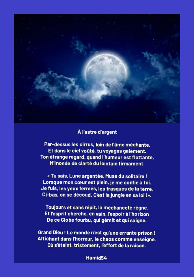 M’inonde de clarté du lointain firmament.« Tu sais, Lune argentée, Muse du solitaire !