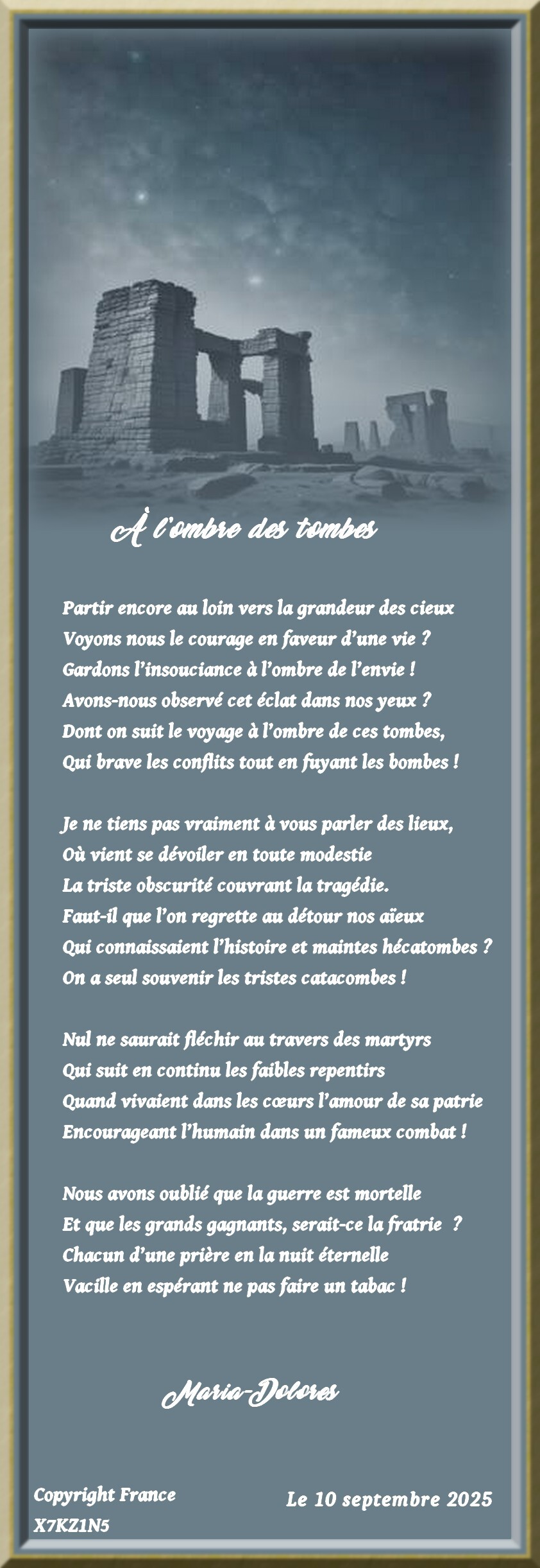 C’est un magnifique poème sombre, émouvant mais tellement réaliste d’un constat de l’humanité face au travers de la guerre où des humains trouvent malgré eux le repos dans une tombe, un peu oublié, certains en héros car la guerre en a fait des martyrs. Les vivants n’ont que leur yeux pour pleurer et se souvenir avec douleur des proches qui leur ont été enlevées.