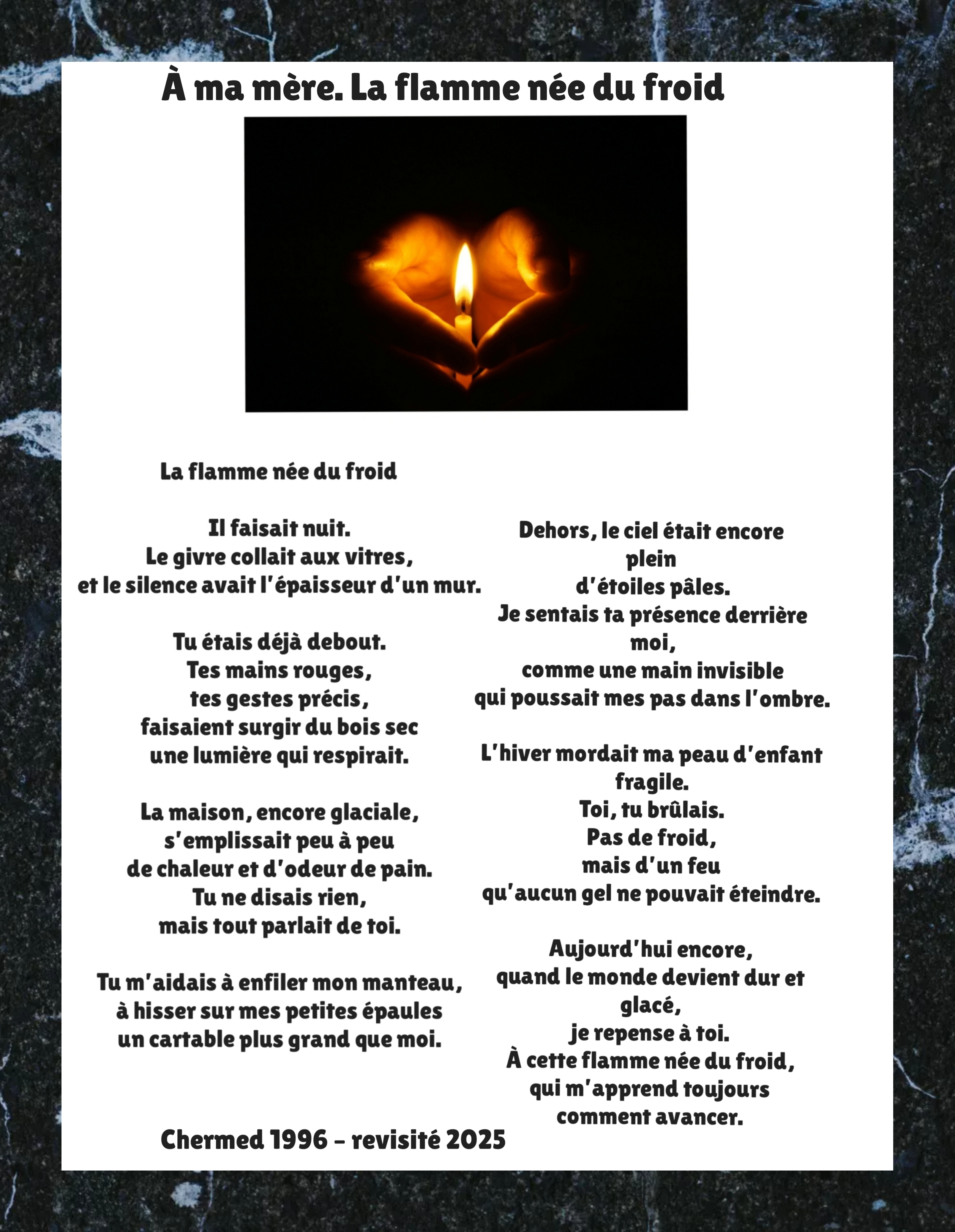 C’est pour ma mère qui nous a quitté très tôt ,il y’a déjà si longtemps que j’avais écrit ce poème, bien des années plus tard. Pour que jamais ne s’efface ce souvenir incandescent .Que son âme repose en paix .