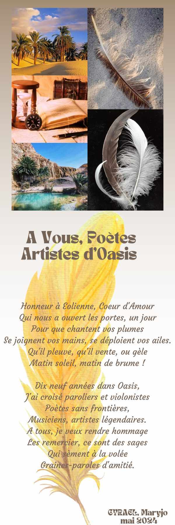 Merci Maryjo pour ce bel hommage en ta poésie remerciant tous les artistes et poètes d’Oasis qui permettent un beau partage.