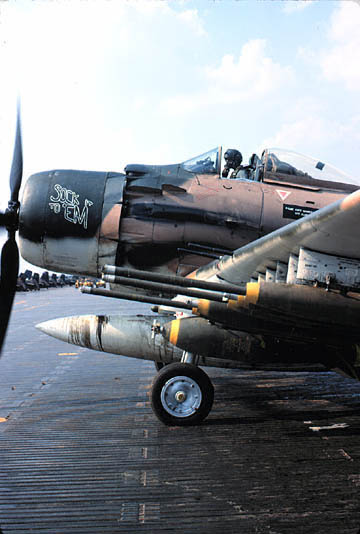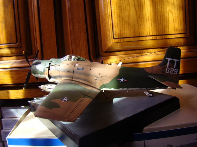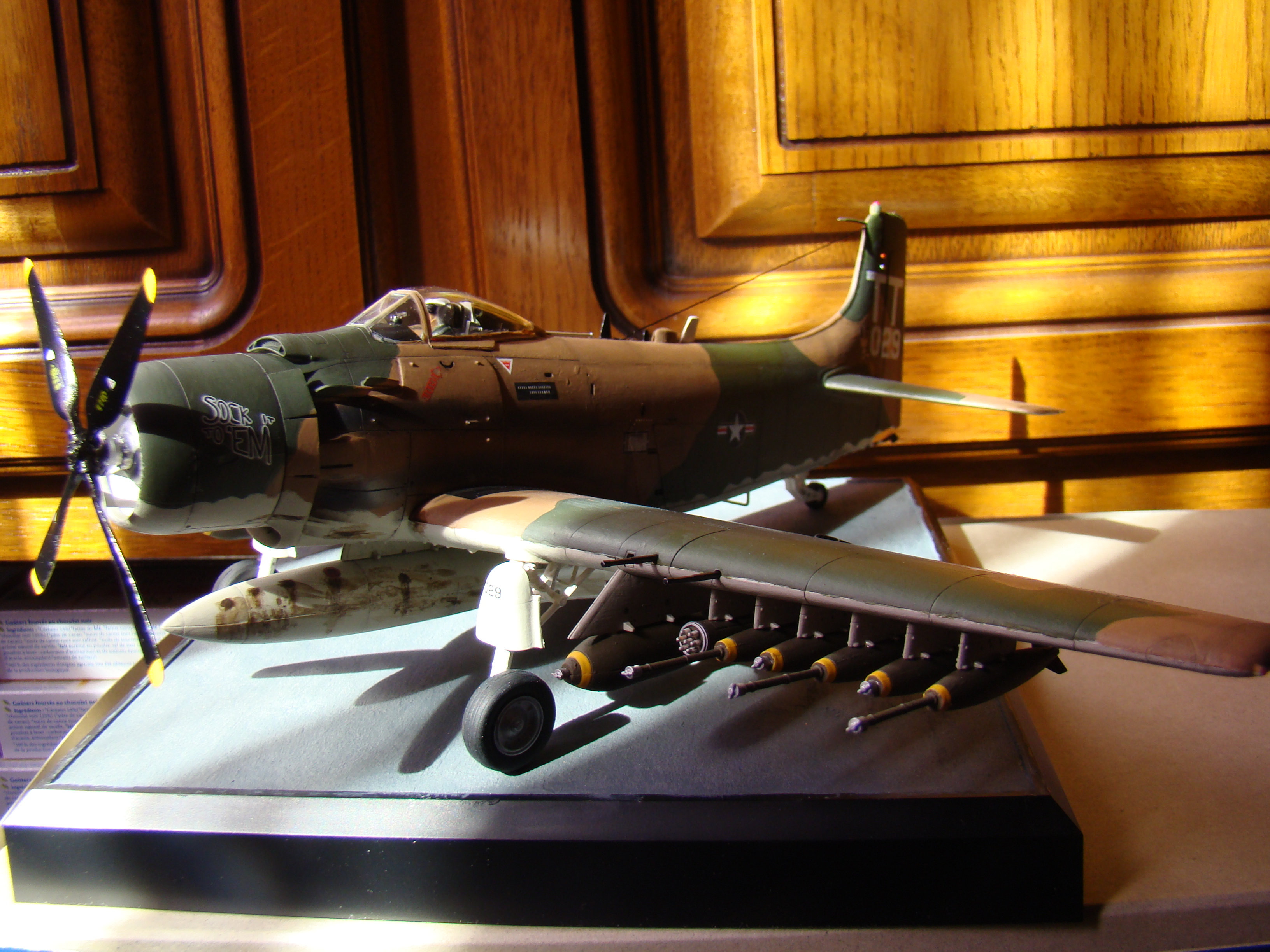 Ce n’est que le 18 Mars 1945 que le premier appareil prend les airs, il est un temps nommé Dauntless II, au départ sa désignation es AD, certains pilotes les appelaient (Able Dog) mais en 1962 la Navy et l’Air Force américaine harmonisent les désignations pour A1Le Skyraider est équipé de grand aérofreins qui montrent bien qu’il devait remplacer le Dauntless dans son rôle de bombardier en piqué, il est équipé de 15 points d’emport qui lui valent d’être considérer comme un « camion à bombes »