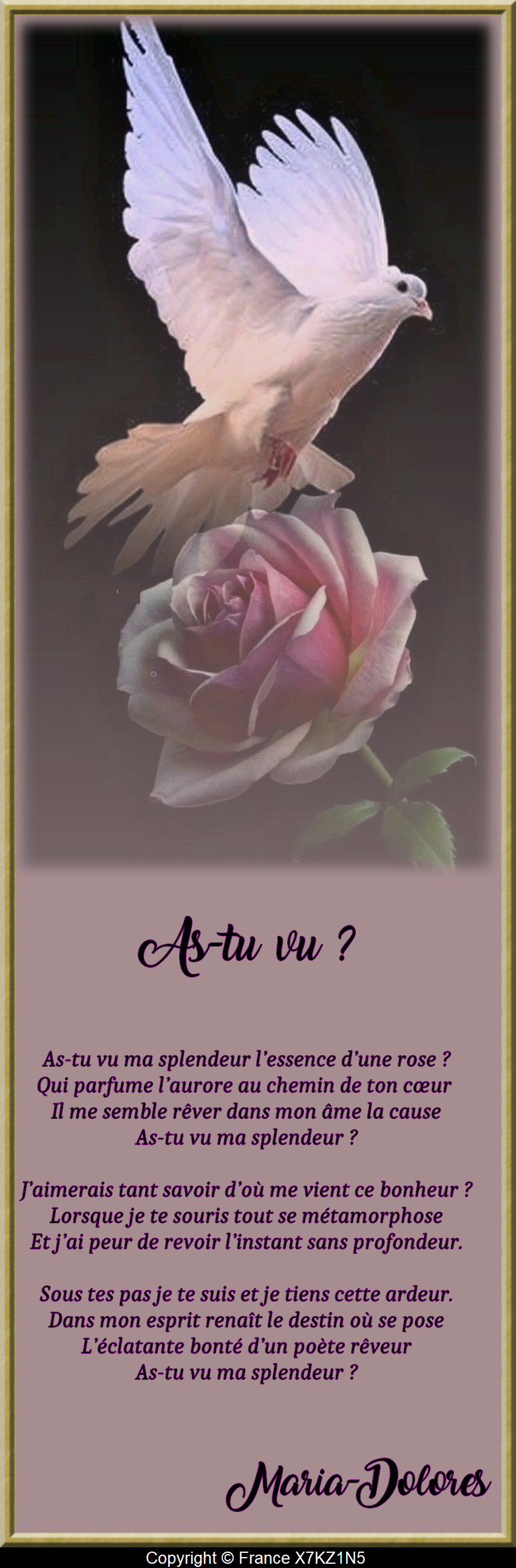 As-tu vu ma splendeur ?J’aimerais tant savoir d’où me vient ce bonheur ?