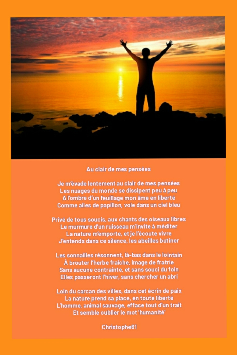 Magnifique poésie où tes pensées voguent en toute liberté en pleine nature afin d’échapper à l’inhumanité qui prospère dans le monde !