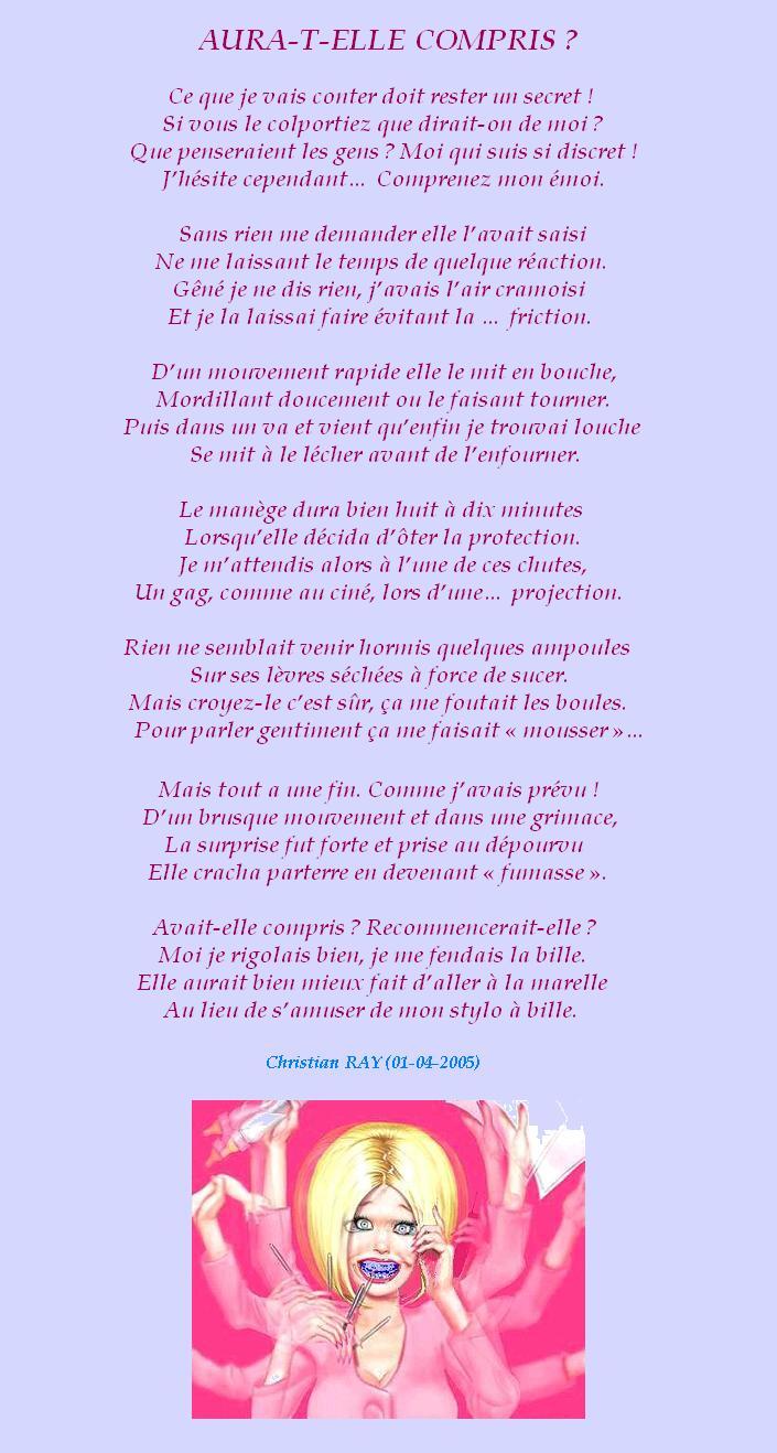 » AURA-T-ELLE COMPRIS ? « Accueil › Vos poèmes ***UN SEUL PAR JOUR*** Les « poèmes » érotiques descriptifs ne sont pas les bienvenus... Ce sujet contient 2 réponses, 3 participants et a été mis à jour pour la dernière fois par Fran?ois, le 28-07-2025 18:26. Créateur Sujet 28 juillet 2025 à 18h26 #2721506 Mascotte d'Oasis christian Sujet: 6554Réponses: 13392 Christian RAY avec Michel Drucker et Patrice Laffont Créateur Sujet Vous lisez 1 fil de discussion Auteur Réponses 28 juillet 2025 à 16h57 #3577226 SybillaMaître des clés Sujet: 5464Réponses: 79667 Bonsoir Cher Ami poète Christian, Pas bien de jouer avec les stylos billes ! On voit la conséquence ! Belle soirée Cher Ami poète Christian ! Toutes mes amitiés Sybilla Le r?ve est le poumon de ma vie (Citation de Sybilla) 28 juillet 2025 à 18h26 #3577237 Fran?ois Sujet: 300Réponses: 49951 Bonsoir Chris, une habitude qui cause bien des soucis plus tard que conte joliment la plume Amitiés La po?sie, c'est comme la cuisine, le mot faitout 00063312-1 Auteur Réponses Vous lisez 1 fil de discussion Vous devez être connecté pour répondre à ce sujet. Connexion Identifiant: Mot de passe: Rester connecté Connexion Log in / Register