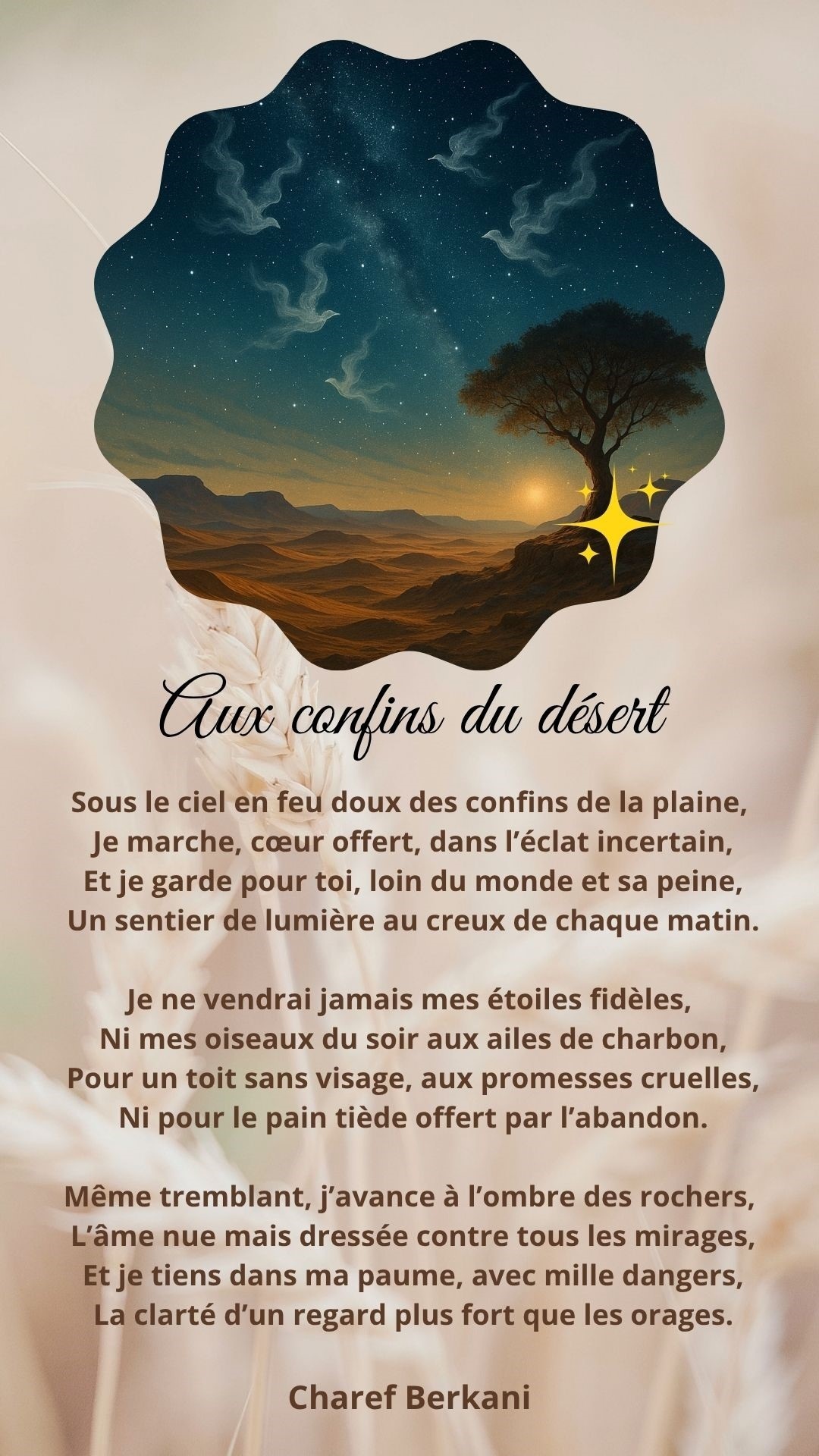 Je n’échangerai pas un battement vrai contre toutes les sécurités du monde. Je suis peut-être tremblant, parfois, mais je suis là, face à ce qu’on n’ose plus nommer. C’est peut-être ça, être brave : continuer à nommer les choses sans les abîmer, regarder l’amour même dans les ombres, prendre la main d’un cœur simple et dire : « Viens, il y a encore du vent à respirer. »Charef Berkani