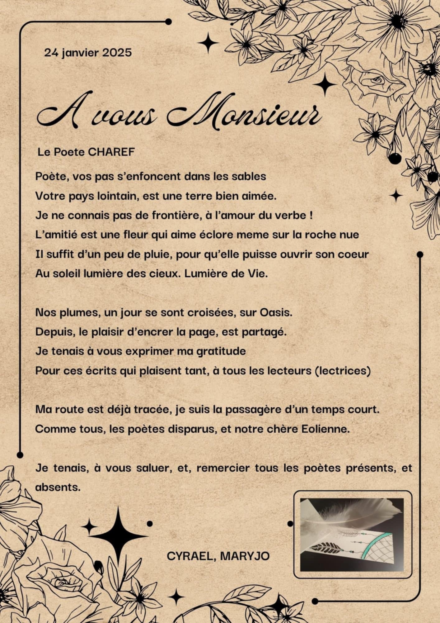 Comme tous, les poètes disparus, et notre chère Eolienne.Je tenais, à vous saluer, et, remercier tous les poètes présents, et absents.