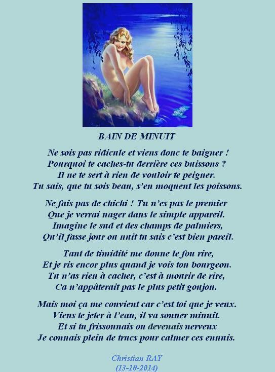 » BAIN DE MINUIT « Accueil › Vos poèmes ***UN SEUL PAR JOUR*** Les « poèmes » érotiques descriptifs ne sont pas les bienvenus... Ce sujet contient 5 réponses, 6 participants et a été mis à jour pour la dernière fois par islander, le 27-06-2025 22:49. Créateur Sujet 27 juin 2025 à 22h49 #2721010 Mascotte d'Oasis christian Sujet: 6554Réponses: 13392 Christian RAY avec Michel Drucker et Patrice Laffont Créateur Sujet Vous lisez 4 fils de discussion Auteur Réponses 27 juin 2025 à 13h09 #3574065 CHANDYLANE Sujet: 411Réponses: 3781 salut CHRIS Une belle invitation à la baignade …adorable les bains de minuit, et avec la chaleur qu’il fait, comment n’en pas rêver ! la toile est belle, et la Belle n’est pas farouche : Bien à toi, mon ami ! 27 juin 2025 à 13h47 #3574073 Mascotte d'Oasis TIZI MOHAMED Sujet: 1702Réponses: 25075 peut être une allergie passagère https://www.edilivre.com/peregrinations-29f53ef39f.html/ https://www.edilivre.com/le-spleen-de-la-logique-de-l-absurde-2c490d0b23.html/ 27 juin 2025 à 15h38 #3574082 Fran?ois Sujet: 300Réponses: 49951 Bonsoir Chris, charmante et amusante invitation à la baignade tardive, tentant par cette saison estivale Amitiés La po?sie, c'est comme la cuisine, le mot faitout 00063312-1 27 juin 2025 à 16h41 #3574091 SybillaMaître des clés Sujet: 5464Réponses: 79667 Bonsoir Cher Ami poète Christian, Et voilà, il suffit de venir te lire pour éclater de rire ! Merci de tous nous donner le sourire sur Oasis ! Belle soirée Cher Ami poète Christian ! Toutes mes amitiés Sybilla Le r?ve est le poumon de ma vie (Citation de Sybilla) 27 juin 2025 à 22h49 #3574113 Mascotte d'Oasis islander Sujet: 2940Réponses: 34198 les ardeurs du poète, inspirent des frissons, très belle plume Auteur Réponses Vous lisez 4 fils de discussion Vous devez être connecté pour répondre à ce sujet. Connexion Identifiant: Mot de passe: Rester connecté Connexion Log in / Register