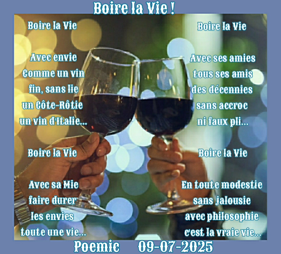 « Boire la vie » ! Quelle chaleureuse idée ! Mais voilà, il y a un mais. Pour boire si bien cette vie, de nos jours il manque une chose primordiale, en avoir les moyens. Maintenant il reste les rêves… La réalité est toute autre… Pourriez vous me donner le remède? Avec toute mon amitié!