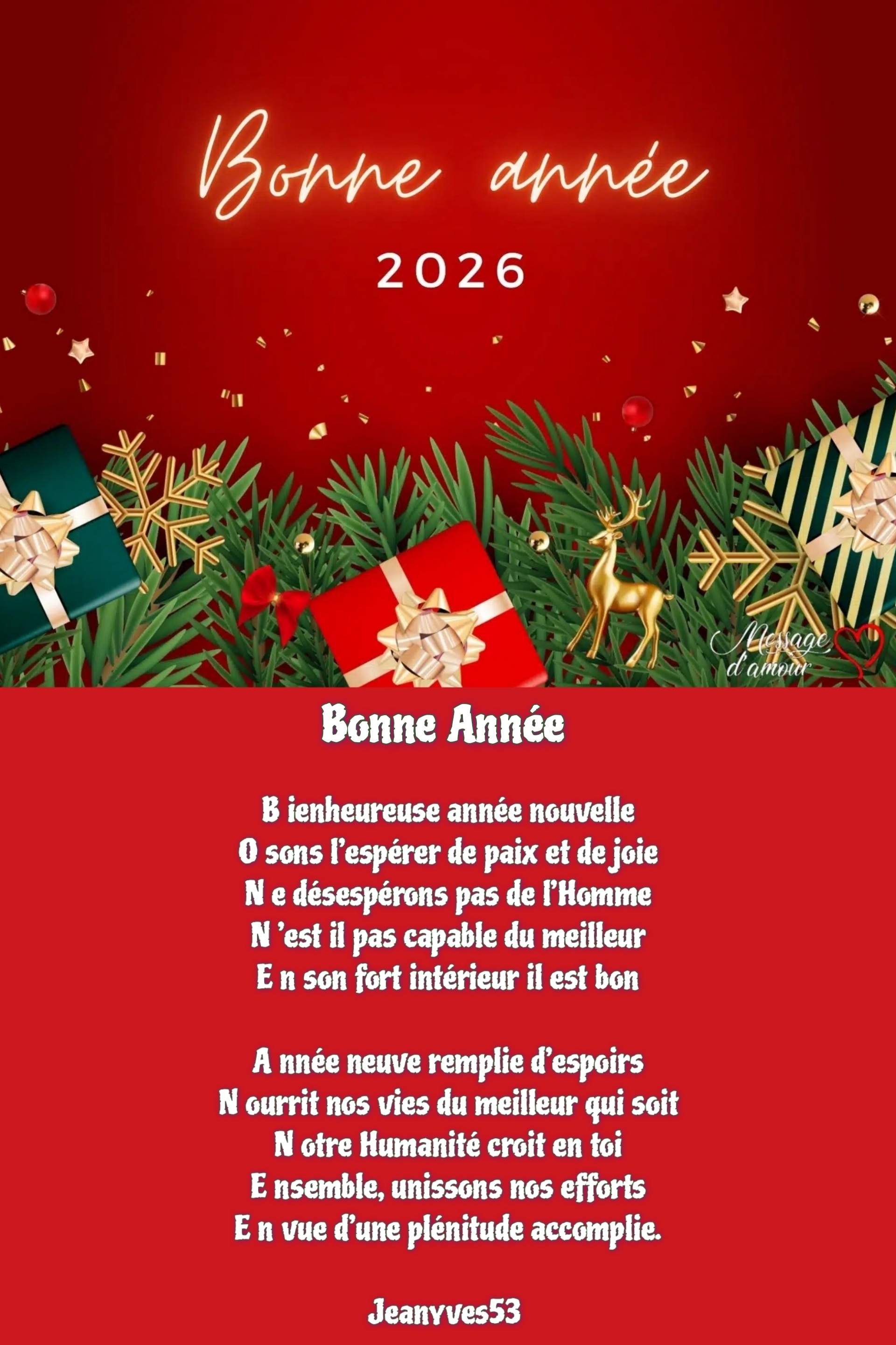 Je te remercie infiniment pour tes vœux et je te présente les miens également de Belle et Heureuse Année 2026 !