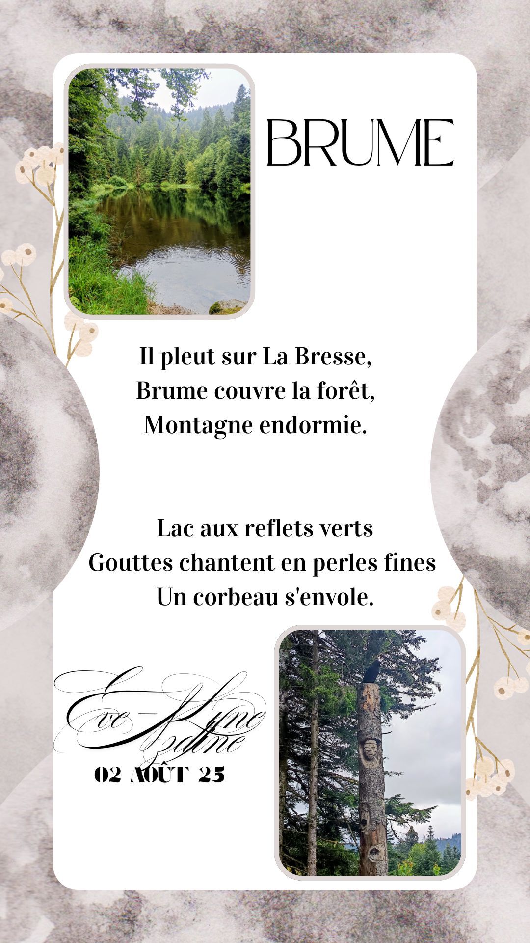 Brume Accueil › Vos poèmes ***UN SEUL PAR JOUR*** Les « poèmes » érotiques descriptifs ne sont pas les bienvenus... Ce sujet contient 11 réponses, 12 participants et a été mis à jour pour la dernière fois par Nataraja, le 14-08-2025 08:59. Créateur Sujet 14 août 2025 à 8h59 #2721715 Plume de platine★★★★★☆ Eve-Lyne Sujet: 747Réponses: 6966 [img width=300][/img] Brume Il pleut sur La Bresse Brume couvre la forêt Montagne endormie Lac aux reflets verts Chant perlé, les gouttes tombent Un corbeau s’envole Eve-Lyne, Nadine 02/08/2025 EvE-LyNe Créateur Sujet Vous lisez 10 fils de discussion Auteur Réponses 6 août 2025 à 18h57 #3578553 HamidParticipant Sujet: 175Réponses: 2795 Bonsoir Nadine. voilà un magnifique haïku qui décrit l’instant avec simplicité et profondeur, captant une scène de la nature sous la pluie. j’aime bien Hamid 6 août 2025 à 19h28 #3578557 Mascotte d'Oasis Marie-Thérèse H. Sujet: 1727Réponses: 26263 une jolie perle de haÏkai Bravo et bisous amitiés https://www.youtube.com/channel/UCpZt6YdLXLyMVA004T1KoiQ ... 6 août 2025 à 20h15 #3578567 SybillaMaître des clés Sujet: 5464Réponses: 79667 Bonsoir Chère Amie poétesse Nadine, Je suis enchantée par ta merveilleuse mise en page ! Elle est féérique ! Et de superbes haïkus bucoliques de toute beauté ! Belle soirée Chère Amie poétesse Nadine ! Toutes mes amitiés Gros bisous Sybilla Le r?ve est le poumon de ma vie (Citation de Sybilla) 6 août 2025 à 23h12 #3578589 Mascotte d'Oasis islander Sujet: 2940Réponses: 34198 bel et doux instantané, se ressourcer par les images, les mots 7 août 2025 à 7h10 #3578624 Fran?ois Sujet: 300Réponses: 49951 Bonjour Eve-Lyne, très beau panorama que décrit la plume Amitiés La po?sie, c'est comme la cuisine, le mot faitout 00063312-1 7 août 2025 à 7h25 #3578632 THAIEVA Sujet: 80Réponses: 3002 Bonjour Eve-lyne, Une belle promenade, un décor magnifique ! Très belle illustration. Thaieva 7 août 2025 à 9h29 #3578649 Daniel Dive Sujet: 2141Réponses: 5677 très jolie poésie sur la Bresse, terre d’étangs, d’oiseaux et de brumes, que tu as su magistralement illustrer. Un pur régal Science sans conscience n'est que ruine de l'?me (Rabelais) 7 août 2025 à 10h30 #3578654 Mascotte d'Oasis TIZI MOHAMED Sujet: 1702Réponses: 25075 superbes haïkus https://www.edilivre.com/peregrinations-29f53ef39f.html/ https://www.edilivre.com/le-spleen-de-la-logique-de-l-absurde-2c490d0b23.html/ 9 août 2025 à 20h26 #3578975 Pierre Sujet: 1417Réponses: 2643 Un très bel haïku sur la Beauté de la Nature !!!! Magique !!!!! Mon amitié Eddy 11 août 2025 à 4h38 #3579111 Thierry jeangneau Sujet: 551Réponses: 3509 Il faut apprécier ce climat… Même si j’apprécie D’avoir récupéré Un climat méditerranéen J’ai l’impression que leclimat marseillais remonte Sur la France 11 août 2025 à 6h25 #3579135 Mascotte d'Oasis Nataraja Sujet: 141Réponses: 4371 Bonjour Eve-Lyne Somptueuse mise en page pour ces beaux haïkus qui nous parlent de la Bresse. Belle journée Nat Les haillons de l’amour ne se reprisent pas . Nataraja. Auteur Réponses Vous lisez 10 fils de discussion Vous devez être connecté pour répondre à ce sujet. Connexion Identifiant: Mot de passe: Rester connecté Connexion Log in / Register