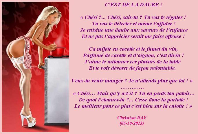 » C’EST DE LA DAUBE ! « Accueil › Vos poèmes ***UN SEUL PAR JOUR*** Les « poèmes » érotiques descriptifs ne sont pas les bienvenus... Ce sujet contient 3 réponses, 4 participants et a été mis à jour pour la dernière fois par Fran?ois, le 12-01-2025 17:16. Créateur Sujet 12 janvier 2025 à 17h16 #2717792 Mascotte d'Oasis christian Sujet: 6554Réponses: 13392 [url=https://zupimages.net/viewer.php?id=22/36/h88u.jpg][/url] Christian RAY avec Michel Drucker et Patrice Laffont Créateur Sujet Vous lisez 2 fils de discussion Auteur Réponses 12 janvier 2025 à 8h26 #3551123 Mascotte d'Oasis Noel-Opan Sujet: 1825Réponses: 9624 En voilà une qui n’a pas la culotte de cheval, à ce que je vois… Bon ! Le bœuf-carotte est au petits oignons.. On rit toujours par ici…enfin très souvent 12 janvier 2025 à 13h06 #3551136 SybillaMaître des clés Sujet: 5464Réponses: 79667 Bonjour Cher Ami poète Christian, Même si elle mijote ce plat chaud, je crains qu’elle ne prenne froid ! Mdrrr ! Merci pour ta belle poésie humoristique ! Belle journée Cher Ami poète Christian ! Toutes mes amitiés Sybilla Le r?ve est le poumon de ma vie (Citation de Sybilla) 12 janvier 2025 à 17h16 #3551173 Fran?ois Sujet: 300Réponses: 49951 Bonsoir Chris, très belle amusette poétique que concocte ta plume Amitiés La po?sie, c'est comme la cuisine, le mot faitout 00063312-1 Auteur Réponses Vous lisez 2 fils de discussion Vous devez être connecté pour répondre à ce sujet. Connexion Identifiant: Mot de passe: Rester connecté Connexion Log in / Register