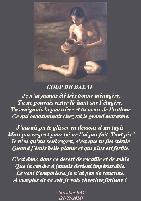 » COUP DE BALAI « Accueil › Vos poèmes ***UN SEUL PAR JOUR*** Les « poèmes » érotiques descriptifs ne sont pas les bienvenus... Ce sujet contient 4 réponses, 5 participants et a été mis à jour pour la dernière fois par TIZI MOHAMED, le 30-12-2023 17:11. Créateur Sujet 30 décembre 2023 à 17h11 #2708030 Mascotte d'Oasis christian Sujet: 6554Réponses: 13392 [url=https://zupimages.net/viewer.php?id=23/52/hxl3.jpg][/url] Christian RAY avec Michel Drucker et Patrice Laffont Créateur Sujet Vous lisez 3 fils de discussion Auteur Réponses 30 décembre 2023 à 11h51 #3488324 SybillaMaître des clés Sujet: 5464Réponses: 79667 Bonjour ChrisR, Très belle poésie mélancolique en partage qui touche les coeurs ! Belle fête de fin d’année ! Belle journée cher ami poète ChrisR ! Toutes mes amitiés Sybilla Le r?ve est le poumon de ma vie (Citation de Sybilla) 30 décembre 2023 à 16h16 #3488339 Fran?ois Sujet: 300Réponses: 49951 Bonsoir Chris, bientôt le ménage de printemps Amitiés La po?sie, c'est comme la cuisine, le mot faitout 00063312-1 30 décembre 2023 à 16h55 #3488349 Mascotte d'Oasis Noel-Opan Sujet: 1825Réponses: 9624 Cela change d’un ballet de Maurice Béjart…mais ça vaut le coup d’être dansé avec un balai.. Bonne fin d’année et bon début pour la prochaine 30 décembre 2023 à 17h11 #3488354 Mascotte d'Oasis TIZI MOHAMED Sujet: 1702Réponses: 25075 à la mer, les cendres de son chéri elle en assez de contempler l’urne elle est vivante, lui il n’est plus là, il a péri elle ne va pas se contenter de fixer les dunes bonne et heureuse année à toi poète https://www.edilivre.com/peregrinations-29f53ef39f.html/ https://www.edilivre.com/le-spleen-de-la-logique-de-l-absurde-2c490d0b23.html/ Auteur Réponses Vous lisez 3 fils de discussion Vous devez être connecté pour répondre à ce sujet. Connexion Identifiant: Mot de passe: Rester connecté Connexion Log in / Register