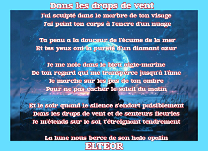 Je m’étends sur le sol, t’étreignant tendrementLa Lune nous berce de son halo opalin