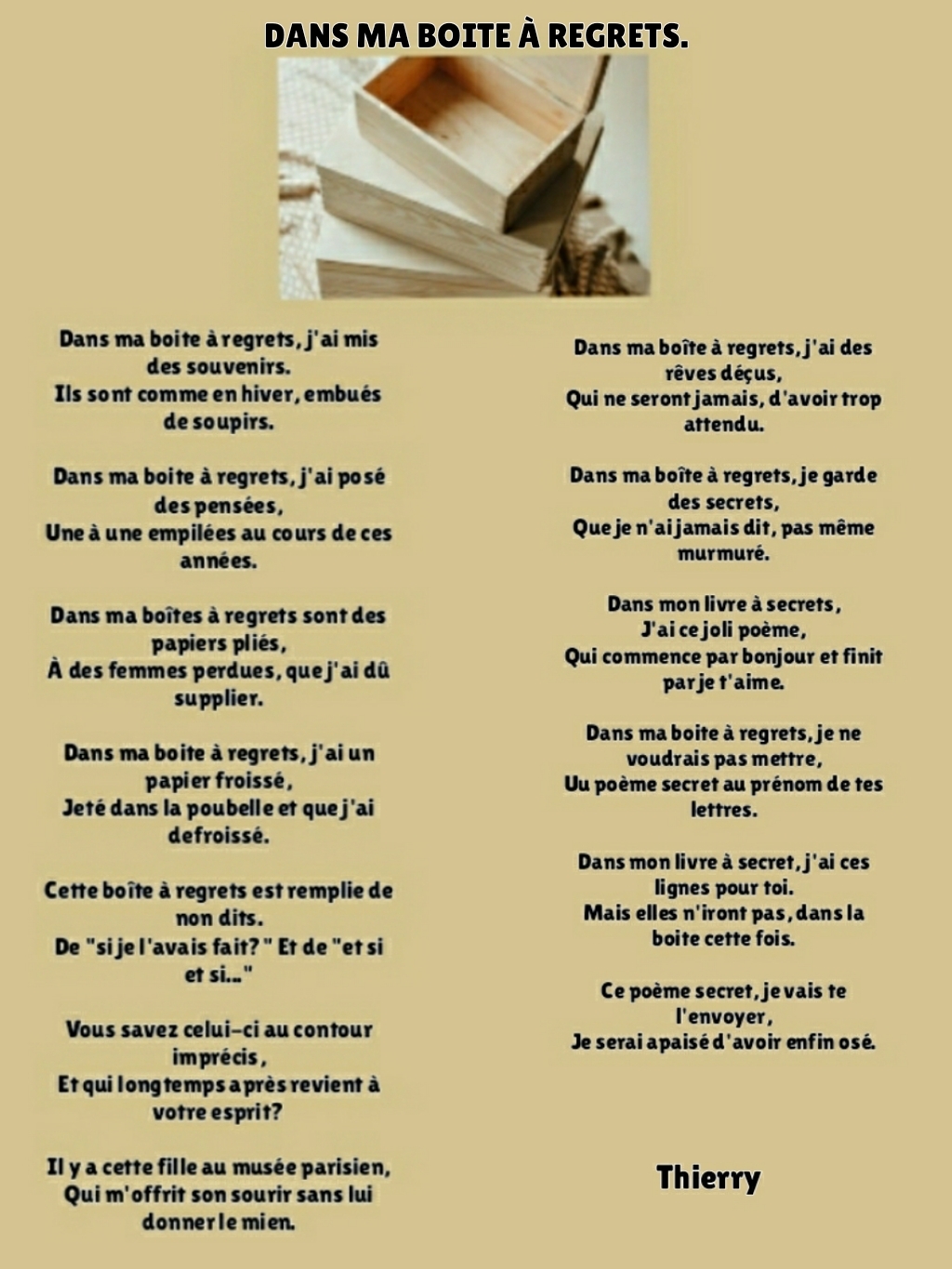 Qui m’offrit son sourir sans lui donner le mien.Dans ma boîte à regrets, j’ai des rêves déçus,