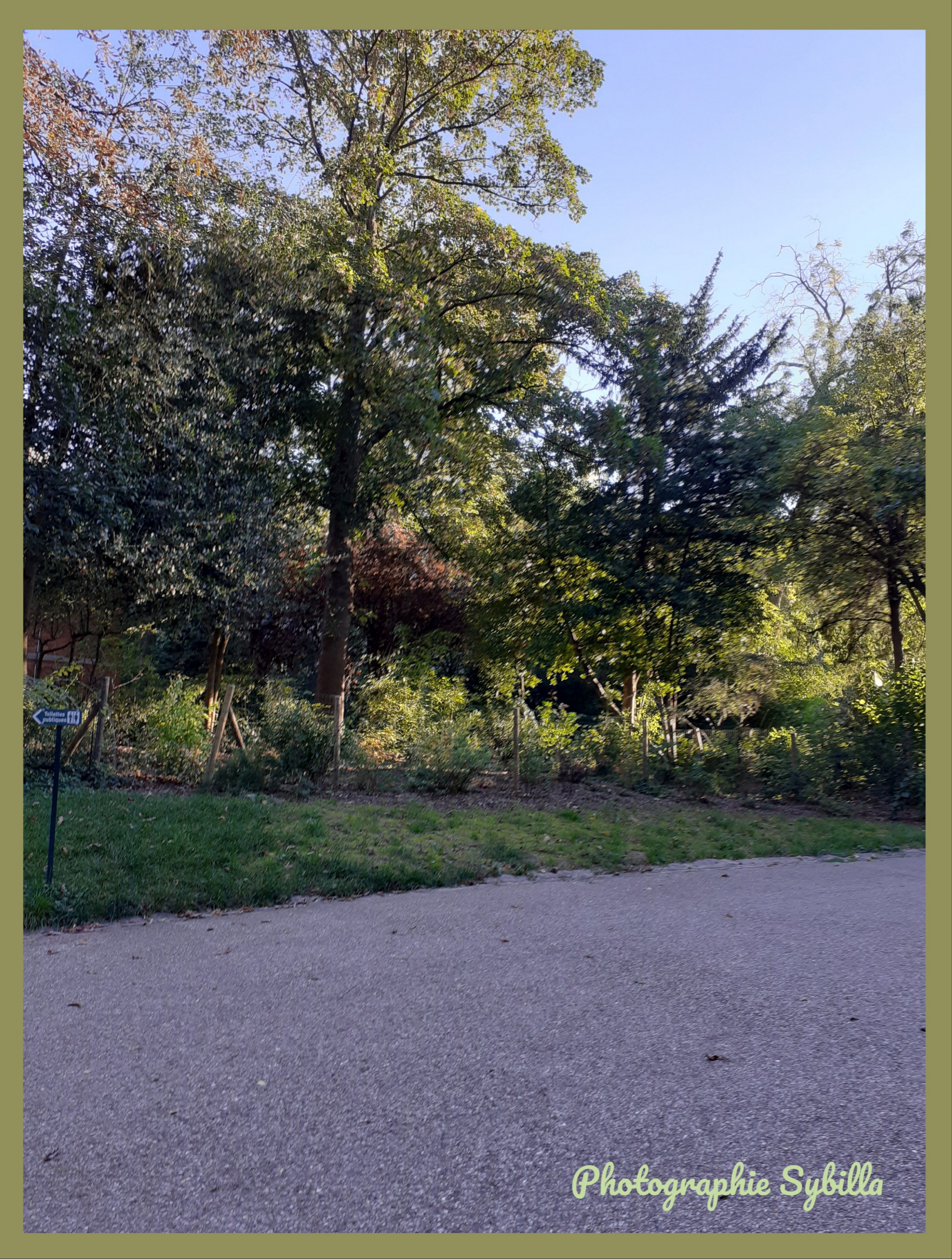 Parc sous un temps clément de ciel bleu. Sans doute entre l’automne et la proximité hivernale. Soleil assez timide camouflé par des couches d’arbres bien verts encore .Exepté quelques feuillus d’un marron logique en la saison .À condition que la photo soit récente évidemment. Clôture peut-être au fond assez cachée délimitant le parc ,son gazon, partie verte, et côté route