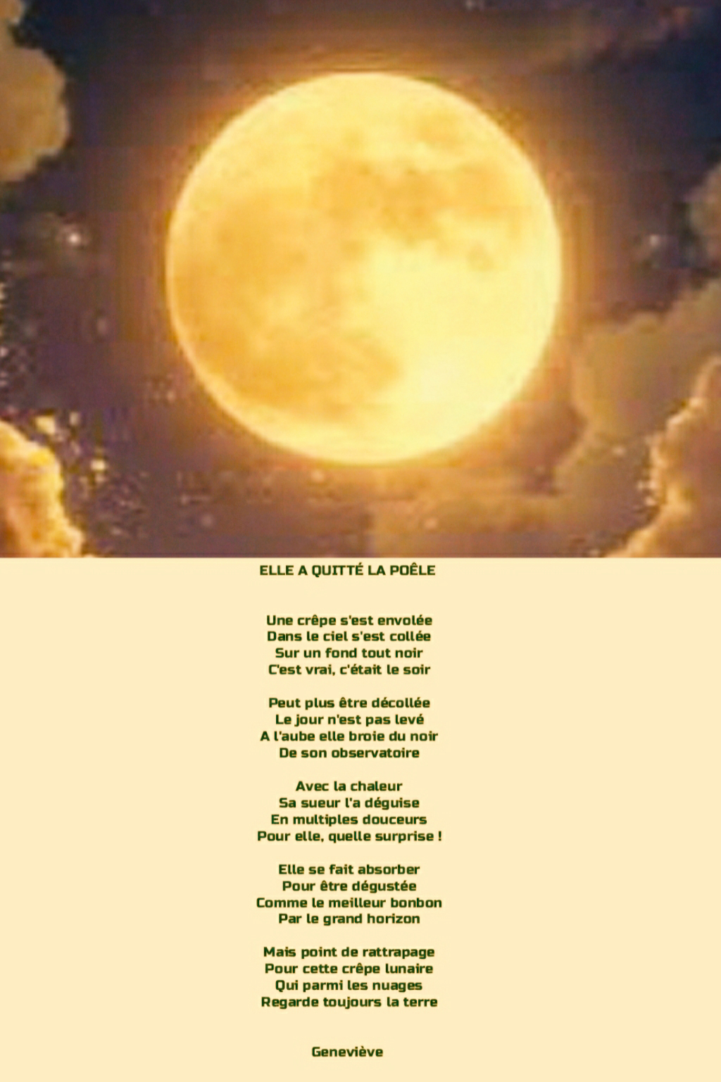 J’ai bien aimé ce charmant et original petit poème qui utilise la crêpe comme une métaphore amusante et poétique de la lune ou d’un astre céleste.