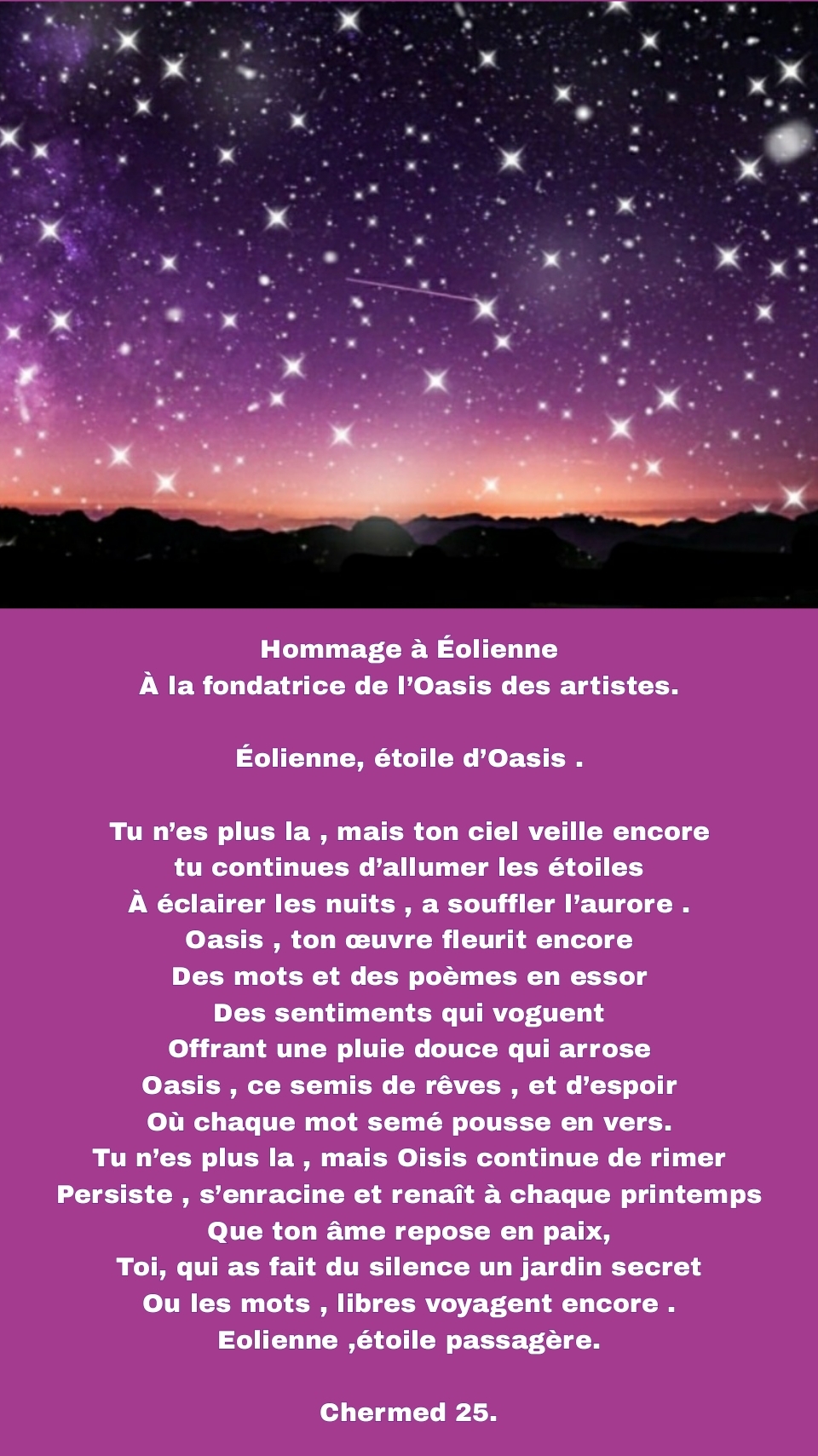 À la fondatrice de l’Oasis des artistes.Éolienne, étoile d’Oasis .