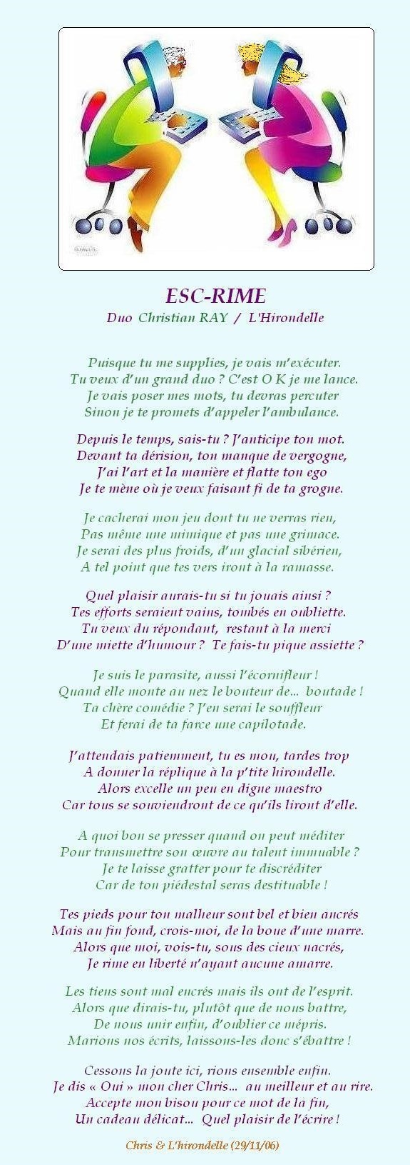 « ESC’- RIME » (duo Chris RAY / L’hirondelle) (humour) Accueil › Vos poèmes ***UN SEUL PAR JOUR*** Les « poèmes » érotiques descriptifs ne sont pas les bienvenus... Ce sujet contient 3 réponses, 4 participants et a été mis à jour pour la dernière fois par islander, le 07-09-2025 22:45. Vous lisez 3 fils de discussion Auteur Messages 7 septembre 2025 à 10h16 #3583091 SybillaMaître des clés Sujet: 5464Réponses: 79667 Bonjour Cher poète Christian, Superbe duo sous vos deux très belles plumes ! Belle journée Cher poète Christian ! Toutes mes amitiés Sybilla Le r?ve est le poumon de ma vie (Citation de Sybilla) 7 septembre 2025 à 18h42 #3583128 Fran?ois Sujet: 300Réponses: 49951 Bonsoir Chris, très beau et cocasse duo Amitiés La po?sie, c'est comme la cuisine, le mot faitout 00063312-1 7 septembre 2025 à 22h45 #2722284 Mascotte d'Oasis christian Sujet: 6554Réponses: 13392 Christian RAY avec Michel Drucker et Patrice Laffont 7 septembre 2025 à 22h45 #3583163 Mascotte d'Oasis islander Sujet: 2940Réponses: 34198 on a dit duo, pas duel, heureusement tout finit bien, un plaisir de lecture, bravo Auteur Messages Vous lisez 3 fils de discussion Vous devez être connecté pour répondre à ce sujet. Connexion Identifiant: Mot de passe: Rester connecté Connexion Log in / Register