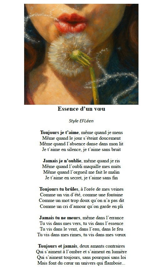 Tu vis dans mes rimes, tu vis dans mes vœuxToujours et jamais, deux amants contraires