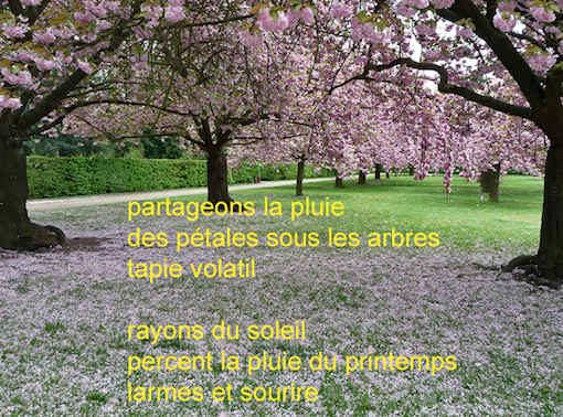 De très beaux haïkus, j ‘aime tout particulièrement l’analogie que vous faites entre les flocons de pétale et les flocons de neige