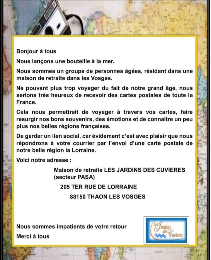 Faire voyager et rêver des résidents de maison de retraite… Accueil › Partages Oasiens : espace convivial Ce sujet contient 3 réponses, 3 participants et a été mis à jour pour la dernière fois par Sybilla, le 07-08-2024 22:22. Créateur Sujet 7 août 2024 à 22h22 #2713851 Mascotte d'Oasis joelle59 Sujet: 1797Réponses: 6841 Amiti?s Jo?lle Créateur Sujet Vous lisez 2 fils de discussion Auteur Réponses 4 août 2024 à 18h40 #3526802 SybillaMaître des clés Sujet: 5464Réponses: 79667 Bonsoir ma Chère Amie Joëlle, Comme l’année dernière, j’enverrai une carte. Je te remercie infiniment pour ces informations ! Belle soirée Chère Amie poétesse Joëlle ! Toutes mes amitiés Gros bisous Sybilla Le r?ve est le poumon de ma vie (Citation de Sybilla) 5 août 2024 à 12h07 #3526918 Plume de diamant★★★★★★ cyrael Sujet: 4849Réponses: 48873 MER CI MADAME JOELLE vous etes adorable je sais ce qu’est la solitude pour ces personnes souvent loin de leur famille j’ai donc pris grand soin à écrire un poème pour eux, et envoyer demain une carte postale sous pli fermé bisous fleuris MERVEILLEUSE idée de partager cette belle invitation à écrire et envoyer un peu de reve à ceux qui en ont tant besoin.. l'Amour rayonne quand l'Ame s'?l?ve, citation maryjo 7 août 2024 à 22h22 #3527071 SybillaMaître des clés Sujet: 5464Réponses: 79667 Bonsoir ma Chère Amie Joëlle, Je suis tellement occupée ces jour-ci que j’ai oublié d’envoyer une carte en espérant qu’il n’est pas trop tard ! Toutes mes excuses ! Je vais le faire comme l’an dernier ! Belle soirée Chère Amie poétesse Joëlle ! Toutes mes amitiés Gros bisous amicaux Sybilla Le r?ve est le poumon de ma vie (Citation de Sybilla) Auteur Réponses Vous lisez 2 fils de discussion Vous devez être connecté pour répondre à ce sujet. Connexion Identifiant: Mot de passe: Rester connecté Connexion Log in / Register
