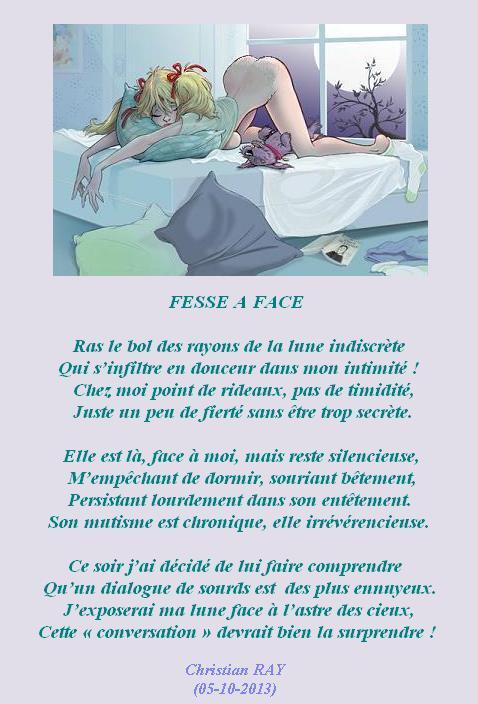 FESSE A FACE… Accueil › Vos poèmes ***UN SEUL PAR JOUR*** Les « poèmes » érotiques descriptifs ne sont pas les bienvenus... Ce sujet contient 5 réponses, 7 participants et a été mis à jour pour la dernière fois par islander, le 29-01-2025 04:02. Vous lisez 5 fils de discussion Auteur Messages 26 janvier 2025 à 12h52 #3553849 Mascotte d'Oasis Salah Sujet: 382Réponses: 2295 Grandiloquence et puissance poétique à lire et à relire Merci poète Salah Quand on a l'esprit ?lev? et le c?ur bas, on ?crit de grandes choses et on en fait de petites. Albert Camus 26 janvier 2025 à 13h55 #3553859 Mascotte d'Oasis TIZI MOHAMED Sujet: 1702Réponses: 25075 un conflit de « lune nette » https://www.edilivre.com/peregrinations-29f53ef39f.html/ https://www.edilivre.com/le-spleen-de-la-logique-de-l-absurde-2c490d0b23.html/ 26 janvier 2025 à 17h30 #3553887 Fran?ois Sujet: 300Réponses: 49951 Bonsoir Chris, très belle cocasserie poétique, l’une est hors de portée pour l’humain lambda quand à l’autre, cela peut être risquer de s’y aventurer sans permission Amitiés La po?sie, c'est comme la cuisine, le mot faitout 00063312-1 26 janvier 2025 à 21h48 #3553932 SybillaMaître des clés Sujet: 5464Réponses: 79667 Bonsoir Cher Ami poète Christian, J’imagine ses voisins… Merci pour cet éclat de rire ! Belle soirée Cher Ami poète Christian ! Toutes mes amitiés Sybilla Le r?ve est le poumon de ma vie (Citation de Sybilla) 29 janvier 2025 à 4h02 #2718098 Mascotte d'Oasis christian Sujet: 6554Réponses: 13392 [url=https://zupimages.net/viewer.php?id=23/38/c758.jpg][/url] Christian RAY avec Michel Drucker et Patrice Laffont 29 janvier 2025 à 4h02 #3554296 Mascotte d'Oasis islander Sujet: 2940Réponses: 34198 au clair de la lune, tout s’éclaire, y a t-il une maison louer non loin ????? Auteur Messages Vous lisez 5 fils de discussion Vous devez être connecté pour répondre à ce sujet. Connexion Identifiant: Mot de passe: Rester connecté Connexion Log in / Register