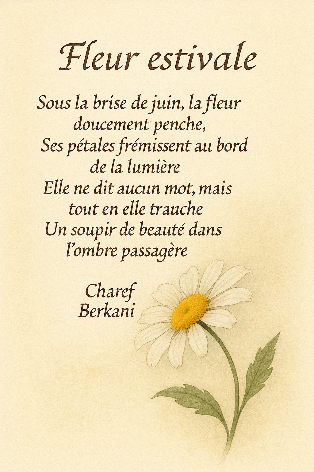 Fleur estivale Accueil › Vos poèmes ***UN SEUL PAR JOUR*** Les « poèmes » érotiques descriptifs ne sont pas les bienvenus... Ce sujet contient 9 réponses, 8 participants et a été mis à jour pour la dernière fois par TIZI MOHAMED, le 16-07-2025 16:24. Créateur Sujet 16 juillet 2025 à 16h24 #2721247 CHAREF Sujet: 527Réponses: 3389 Chaque homme porte en lui l'enfant qu'il ?tait Charef Créateur Sujet Vous lisez 8 fils de discussion Auteur Réponses 12 juillet 2025 à 15h31 #3575528 CHAREF Sujet: 527Réponses: 3389 Expressif et plein de sensualité ton commentaire. Merci infiniment James. Excellente journée. Chaque homme porte en lui l'enfant qu'il ?tait Charef 12 juillet 2025 à 16h44 #3575535 SEMAPHORE Sujet: 565Réponses: 3015 Bonjour Guépard, Une très belle poésie sur cette « Fleur Estivale » au parfum délicat . 12 juillet 2025 à 19h42 #3575563 Fran?ois Sujet: 300Réponses: 49951 Bonsoir guepard, très belle éclosion de vers Amicalement La po?sie, c'est comme la cuisine, le mot faitout 00063312-1 12 juillet 2025 à 19h48 #3575565 CathysoleilParticipant Sujet: 241Réponses: 2842 Bonjour Guépard, merci pour ce magnifique poème rempli de douceur. C’est très joli! La mise en page est superbe. Merci de m'avoir lue. 00056292-1 13 juillet 2025 à 3h17 #3575576 Mascotte d'Oasis islander Sujet: 2940Réponses: 34198 superbe et délicat, les fleurs embellissent la terre, c’est indéniable et nécessaire 13 juillet 2025 à 4h41 #3575584 CHAREF Sujet: 527Réponses: 3389 SEMAPHORE EvilFranck Cathysoleil islander Merci pour vos commentaires Chaque homme porte en lui l'enfant qu'il ?tait Charef 13 juillet 2025 à 16h25 #3575630 BOUCHARBA Sujet: 350Réponses: 1551 l’été, une fleur, c’est un peu rare, l’auteur du poème semble nous cacher un mystère…une lecture qui me laisse sur ma faim. Merci Guepard 14 juillet 2025 à 20h41 #3575763 SybillaMaître des clés Sujet: 5464Réponses: 79667 Bonsoir Cher Ami poète Charef, Une poésie très tendre et douce sur cette fleur en transmutation lors de son éclosion d’une grande suavité ! Belle soirée Cher Ami poète Charef ! Toutes mes amitiés Sybilla Le r?ve est le poumon de ma vie (Citation de Sybilla) 16 juillet 2025 à 16h24 #3575946 Mascotte d'Oasis TIZI MOHAMED Sujet: 1702Réponses: 25075 une fleur inspirante https://www.edilivre.com/peregrinations-29f53ef39f.html/ https://www.edilivre.com/le-spleen-de-la-logique-de-l-absurde-2c490d0b23.html/ Auteur Réponses Vous lisez 8 fils de discussion Vous devez être connecté pour répondre à ce sujet. Connexion Identifiant: Mot de passe: Rester connecté Connexion Log in / Register