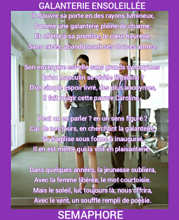 Très belle poésie sur la galanterie et la courtoisie si agréables, tendant déjà de nos jours à se perdre hélas !