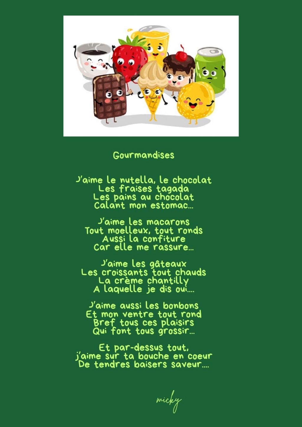 Une énumération d’aliments auxquels on a beaucoup de mal à résister mais dont il faut se méfier car ils sont trop sucrés. Votre poème les mentionne d’une manière très humoristique