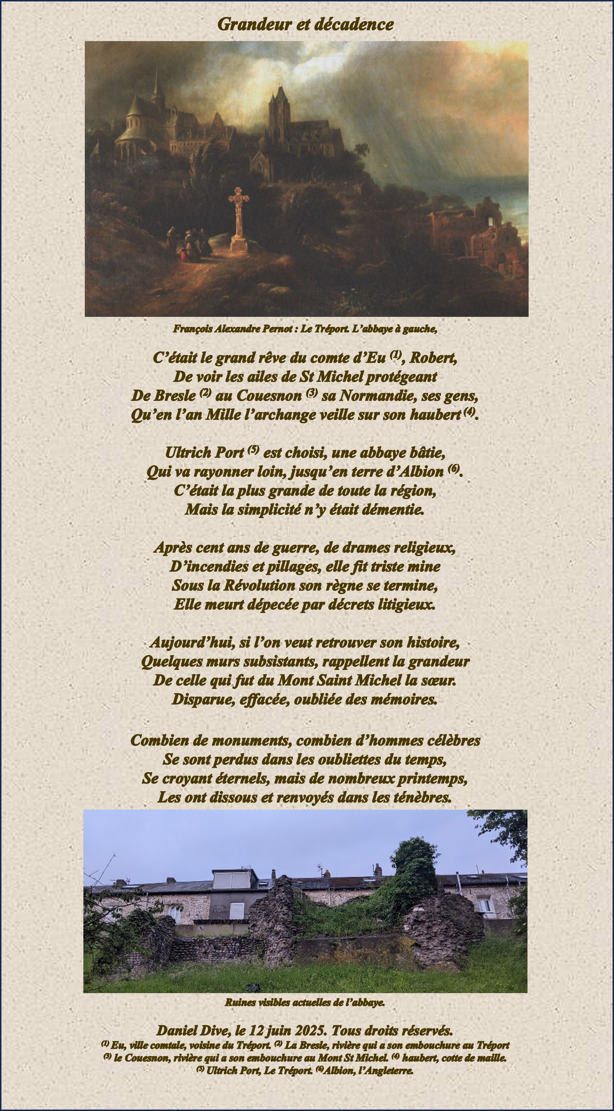 Je tiens à remercier ici Monsieur Michel Bilon, écrivain de l’histoire du Tréport, pour m’avoir permis de puiser dans ses documents pour poétiser cette histoire de l’abbaye qui est réelle.