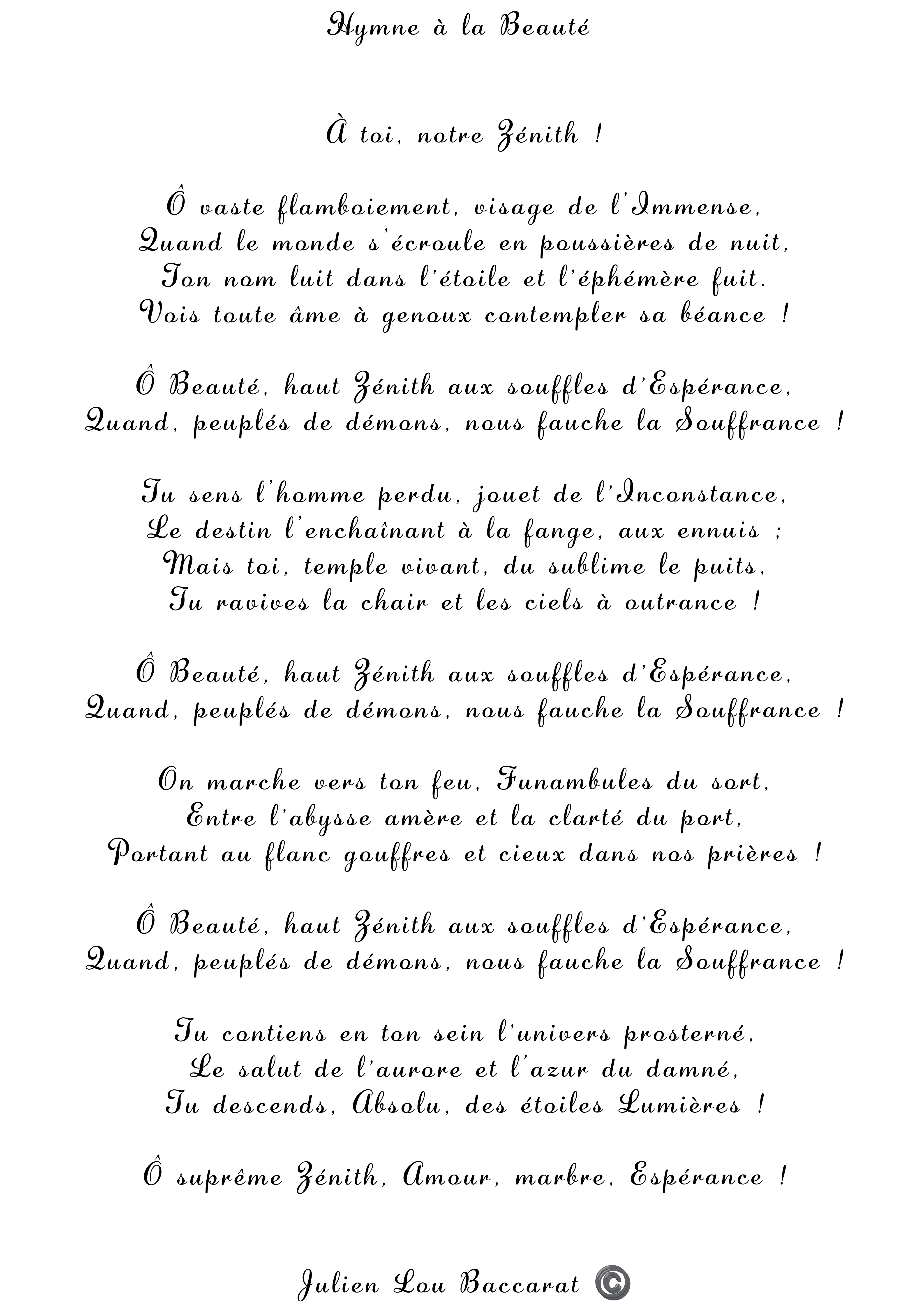 Un magnifique poème qui rend hommage à la beauté en l’élevant au-dessus de tout ce qui existe : « O Beauté, haut Zénith aux souffles d’espérance » et l’illumine comme la lumière primordiale