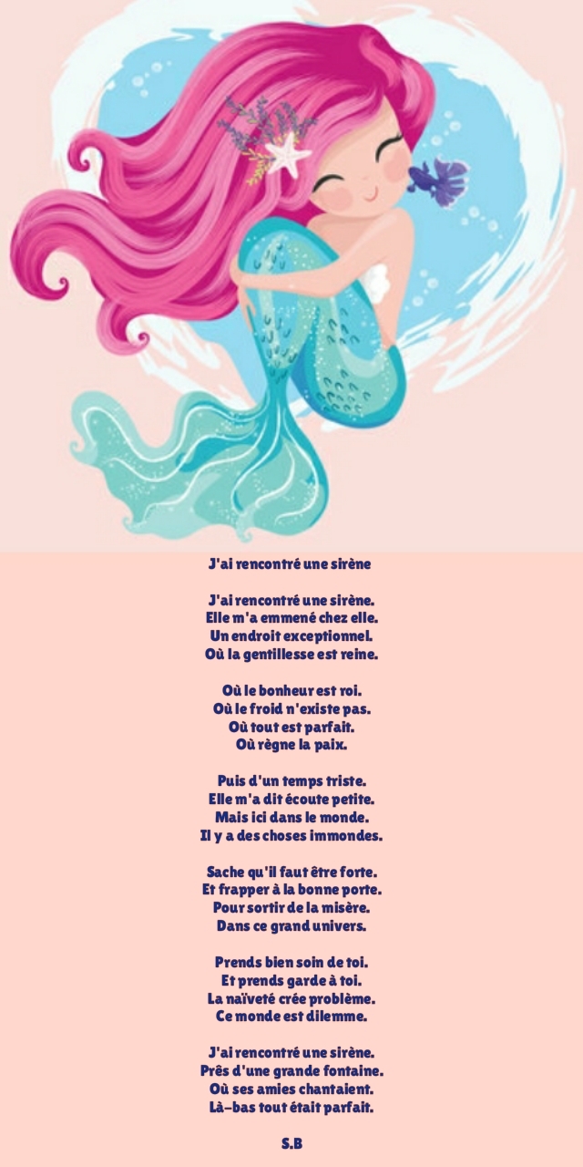 Un très beau poème pour cette histoire imaginaire et féerique de sirène qui rêve d’un monde magique et de paix.