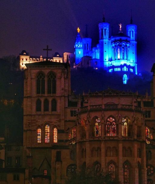 De belles couleurs pour le 8 décembre rendant un effet bleuté de la basilique Notre-Dame de Fourvière dans la nuit.