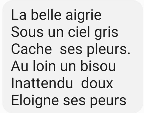 La belle aigrie Accueil › Vos poèmes ***UN SEUL PAR JOUR*** Les « poèmes » érotiques descriptifs ne sont pas les bienvenus... Ce sujet contient 7 réponses, 7 participants et a été mis à jour pour la dernière fois par jaspelia, le 09-01-2025 08:21. Créateur Sujet 9 janvier 2025 à 8h21 #2708301 jaspelia Sujet: 925Réponses: 2670 .[url=https://zupimages.net/viewer.php?id=24/02/0aib.jpg][/url] Mes meilleurs vœux à tous , surtout la santé ! Créateur Sujet Vous lisez 6 fils de discussion Auteur Réponses 9 janvier 2024 à 10h19 #3489738 Plume de diamant★★★★★★ cyrael Sujet: 4849Réponses: 48873 elle pleure la dame de coeur bien triste est ton poème bisous, je te souhaite une douce année meilleurs voeux Jaspelia l'Amour rayonne quand l'Ame s'?l?ve, citation maryjo 9 janvier 2024 à 13h58 #3489763 SybillaMaître des clés Sujet: 5464Réponses: 79667 Bonjour ma chère amie Jaspelia, Je suis ravie de ton retour parmi nous toutes et tous ! Une poésie bien triste et sombre avec une légère éclaircie à la chute de tes vers.! Je te souhaite une très Douce et Heureuse Année 2024 ! Douce journée chère amie poétesse Jaspelia ! Toutes mes amitiés Prends bien soin de toi et gros bisous Sybilla Le r?ve est le poumon de ma vie (Citation de Sybilla) 9 janvier 2024 à 16h13 #3489789 Mascotte d'Oasis TIZI MOHAMED Sujet: 1702Réponses: 25075 que de tristesse en ce temps triste bien à toi poétesse https://www.edilivre.com/peregrinations-29f53ef39f.html/ https://www.edilivre.com/le-spleen-de-la-logique-de-l-absurde-2c490d0b23.html/ 9 janvier 2024 à 16h18 #3489791 Patricia D’HENRY Sujet: 296Réponses: 1226 Comme quoi quand l l’amour est la… Meme la belle aigrie n’en revient pas. Inattendu et très veau NAMASTE Mon recueil de po?sie UNE VIE EN BALADE est disponible sur la FNAC en ligne 9 janvier 2024 à 16h26 #3489798 Fran?ois Sujet: 300Réponses: 49951 Bonsoir jaspelia, très touchant poème Meilleurs voeux Amitiés La po?sie, c'est comme la cuisine, le mot faitout 00063312-1 12 janvier 2024 à 13h50 #3490184 jaspelia Sujet: 925Réponses: 2670 Bonjour amis de poésie Merci , mes sincères vœux 9 janvier 2025 à 8h21 #3494388 jaspelia Sujet: 925Réponses: 2670 Bonjour Merci pour vos commentaires bonne journée à vous Auteur Réponses Vous lisez 6 fils de discussion Vous devez être connecté pour répondre à ce sujet. Connexion Identifiant: Mot de passe: Rester connecté Connexion Log in / Register