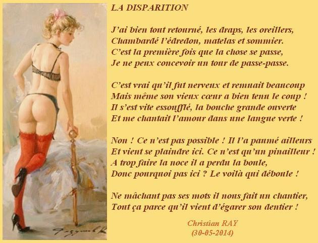 » LA DISPARITION « Accueil › Vos poèmes ***UN SEUL PAR JOUR*** Les « poèmes » érotiques descriptifs ne sont pas les bienvenus... Ce sujet contient 2 réponses, 3 participants et a été mis à jour pour la dernière fois par Sybilla, le 29-05-2025 16:32. Créateur Sujet 29 mai 2025 à 16h32 #2720421 Mascotte d'Oasis christian Sujet: 6554Réponses: 13392 CLIC GAUCHE SUR L’IMAGE POUR AGRANDIR ET LIRE ou CLIC DROIT et choisir « Agrandir l’image » [url=https://zupimages.net/viewer.php?id=24/30/47h4.jpg][/url] Christian RAY avec Michel Drucker et Patrice Laffont Créateur Sujet Vous lisez 1 fil de discussion Auteur Réponses 29 mai 2025 à 16h32 #3569933 Fran?ois Sujet: 300Réponses: 49951 Bonsoir Chris, hélas pour certains passé un âge, il devient moins aisé de mordre la vie à pleine dent Amitiés La po?sie, c'est comme la cuisine, le mot faitout 00063312-1 29 mai 2025 à 16h32 #3569934 SybillaMaître des clés Sujet: 5464Réponses: 79667 Bonsoir Cher Ami poète Christian, Et quelle disparition ! Merci pour le sourire ! Belle soirée Cher Ami poète Christian ! Toutes mes amitiés Sybilla Le r?ve est le poumon de ma vie (Citation de Sybilla) Auteur Réponses Vous lisez 1 fil de discussion Vous devez être connecté pour répondre à ce sujet. Connexion Identifiant: Mot de passe: Rester connecté Connexion Log in / Register