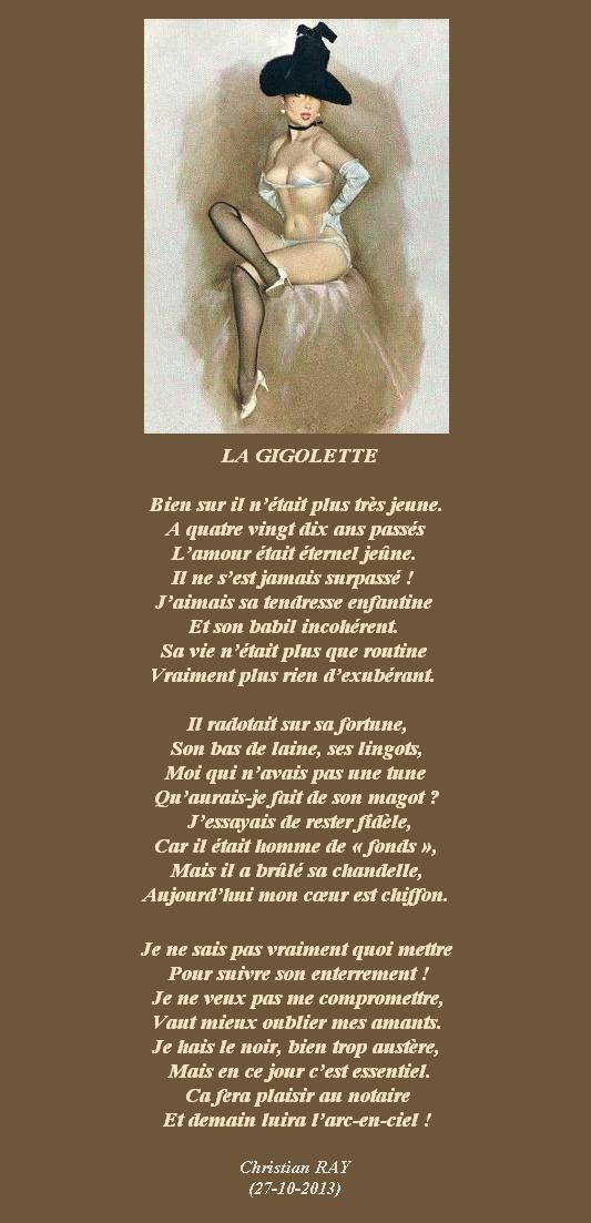 » LA GIGOLETTE « Accueil › Vos poèmes ***UN SEUL PAR JOUR*** Les « poèmes » érotiques descriptifs ne sont pas les bienvenus... Ce sujet contient 6 réponses, 7 participants et a été mis à jour pour la dernière fois par Fran?ois, le 04-04-2025 17:40. Créateur Sujet 4 avril 2025 à 17h40 #2719027 Mascotte d'Oasis christian Sujet: 6554Réponses: 13392 [url=https://zupimages.net/viewer.php?id=25/13/j608.jpg][/url] Christian RAY avec Michel Drucker et Patrice Laffont Créateur Sujet Vous lisez 5 fils de discussion Auteur Réponses 30 mars 2025 à 7h07 #3560713 Linette Sujet: 1161Réponses: 5998 Bonjour Chris, J’adore le titre de ton poème qui donne déjà une idée du contenu. Quel humour ! Bravo, bravo ! Bises Linette 30 mars 2025 à 7h37 #3560719 SybillaMaître des clés Sujet: 5464Réponses: 79667 Bonjour Cher Ami poète Christian, Toujours aussi humoristiques tes poésies ! Merci de nous offrir le sourire ! Belle journée Cher Ami poète Christian ! Toutes mes amitiés Sybilla Le r?ve est le poumon de ma vie (Citation de Sybilla) 30 mars 2025 à 8h40 #3560727 Mickaelle Sujet: 781Réponses: 13295 j’aurais bien aimé le lire, mais c’est trop petit, et si je veux le mettre en grand, j’ai EXTENSION IMAGES..et je sais pas faire………si vous savez, je veux bien savoir……….. 30 mars 2025 à 12h35 #3560751 Webmaster joelParticipant Sujet: 56Réponses: 1643 Bonjour Christian Je suis venu rire en lisant ta poésie. Toujours plein d’humour. bonne journée Mes amitiés JOEL 30 mars 2025 à 13h31 #3560759 Mascotte d'Oasis TIZI MOHAMED Sujet: 1702Réponses: 25075 lui il cherchait à s’assumer et elle cherchait à consommer le magot https://www.edilivre.com/peregrinations-29f53ef39f.html/ https://www.edilivre.com/le-spleen-de-la-logique-de-l-absurde-2c490d0b23.html/ 4 avril 2025 à 17h40 #3561256 Fran?ois Sujet: 300Réponses: 49951 Bonsoir Chris, très belle amusette poétique Amitiés La po?sie, c'est comme la cuisine, le mot faitout 00063312-1 Auteur Réponses Vous lisez 5 fils de discussion Vous devez être connecté pour répondre à ce sujet. Connexion Identifiant: Mot de passe: Rester connecté Connexion Log in / Register