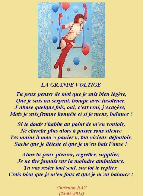 » LA GRANDE VOLTIGE « Accueil › Vos poèmes ***UN SEUL PAR JOUR*** Les « poèmes » érotiques descriptifs ne sont pas les bienvenus... Ce sujet contient 3 réponses, 4 participants et a été mis à jour pour la dernière fois par Sybilla, le 31-05-2025 21:14. Créateur Sujet 31 mai 2025 à 21h14 #2720460 Mascotte d'Oasis christian Sujet: 6554Réponses: 13392 CLIC GAUCHE SUR L’IMAGE POUR AGRANDIR ET LIRE ou CLIC DROIT et choisir « Agrandir l’image » [url=https://zupimages.net/viewer.php?id=24/30/3o04.jpg][/url] Christian RAY avec Michel Drucker et Patrice Laffont Créateur Sujet Vous lisez 2 fils de discussion Auteur Réponses 31 mai 2025 à 15h19 #3570220 Mascotte d'Oasis poemic Sujet: 1020Réponses: 17621 Triste cette 25eme heure ! çà va s’arranger , à l’aube ou un autre soir ! bonne soirée cher Christian [color=990000]MON 2eme RECUEIL...JE TE PORTE L'AUBE..EST DISPONIBLE..[/color] http://www.oasisdesartistes.com/modules/newbbex/viewtopic.php?topic_id=97282&forum=47 31 mai 2025 à 18h16 #3570241 Fran?ois Sujet: 300Réponses: 49951 Bonsoir Chris, que ne feraient pas certaines pour s’envoyer en l’air Amitiés La po?sie, c'est comme la cuisine, le mot faitout 00063312-1 31 mai 2025 à 21h14 #3570272 SybillaMaître des clés Sujet: 5464Réponses: 79667 Bonsoir Cher Ami poète Christian, Merci pour ce nouvel éclat de rire ! Belle soirée Cher Ami poète Christian ! Toutes mes amitiés Sybilla Le r?ve est le poumon de ma vie (Citation de Sybilla) Auteur Réponses Vous lisez 2 fils de discussion Vous devez être connecté pour répondre à ce sujet. Connexion Identifiant: Mot de passe: Rester connecté Connexion Log in / Register