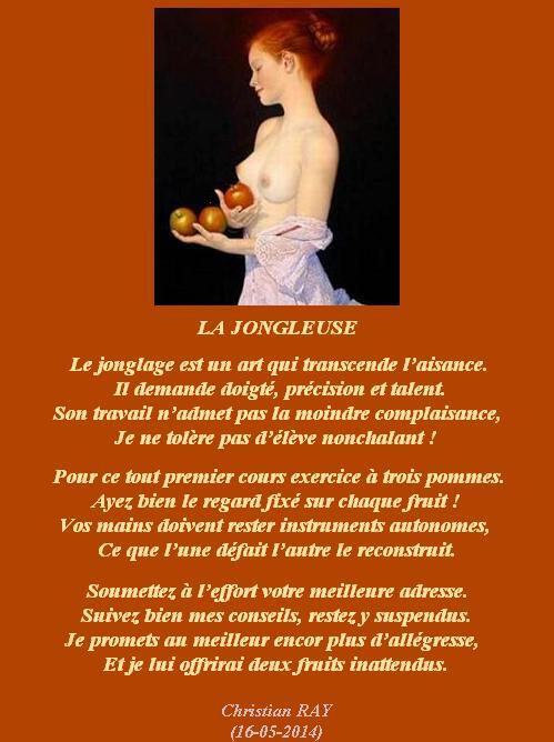 » LA JONGLEUSE « Accueil › Vos poèmes ***UN SEUL PAR JOUR*** Les « poèmes » érotiques descriptifs ne sont pas les bienvenus... Ce sujet contient 4 réponses, 5 participants et a été mis à jour pour la dernière fois par islander, le 01-06-2025 23:22. Créateur Sujet 1 juin 2025 à 23h22 #2720484 Mascotte d'Oasis christian Sujet: 6554Réponses: 13392 CLIC GAUCHE SUR L’IMAGE POUR AGRANDIR ET LIRE ou CLIC DROIT et choisir « Agrandir l’image » [url=https://zupimages.net/viewer.php?id=24/31/f9dy.jpg][/url] Christian RAY avec Michel Drucker et Patrice Laffont Créateur Sujet Vous lisez 3 fils de discussion Auteur Réponses 1 juin 2025 à 17h02 #3570371 Fran?ois Sujet: 300Réponses: 49951 Bonsoir Chris, très belle friponnerie poétique Amitiés La po?sie, c'est comme la cuisine, le mot faitout 00063312-1 1 juin 2025 à 18h30 #3570383 SybillaMaître des clés Sujet: 5464Réponses: 79667 Bonsoir Cher Ami poète Christian, Une belle poésie humoristique que nous confie ta plume ! Belle soirée Cher Ami poète Christian ! Toutes mes amitiés Sybilla Le r?ve est le poumon de ma vie (Citation de Sybilla) 1 juin 2025 à 18h32 #3570384 Mascotte d'Oasis TIZI MOHAMED Sujet: 1702Réponses: 25075 un jonglage qui donne ses fruits https://www.edilivre.com/peregrinations-29f53ef39f.html/ https://www.edilivre.com/le-spleen-de-la-logique-de-l-absurde-2c490d0b23.html/ 1 juin 2025 à 23h22 #3570429 Mascotte d'Oasis islander Sujet: 2940Réponses: 34198 il est plus facile de jongler avec certains fruits qu’avec d’autres, jolie lecture qui inspire, merci poète Auteur Réponses Vous lisez 3 fils de discussion Vous devez être connecté pour répondre à ce sujet. Connexion Identifiant: Mot de passe: Rester connecté Connexion Log in / Register