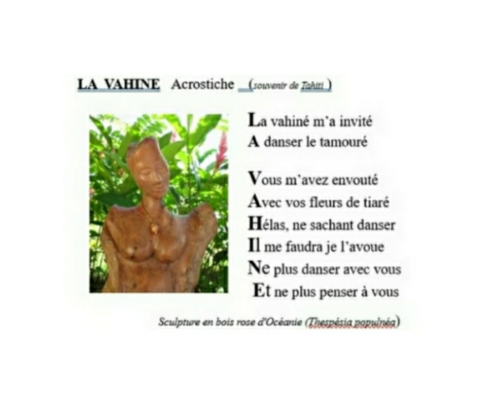 Très bel acrostiche sur la vahiné qu’il ne faut surtout pas oublier ni même cette magnifique statuette en souvenir de Tahiti.