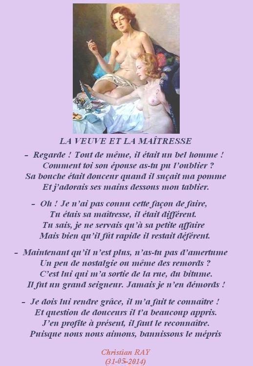 » LA VEUVE ET LA MAITRESSE « Accueil › Vos poèmes ***UN SEUL PAR JOUR*** Les « poèmes » érotiques descriptifs ne sont pas les bienvenus... Ce sujet contient 3 réponses, 4 participants et a été mis à jour pour la dernière fois par Thierry jeangneau, le 05-06-2025 03:58. Créateur Sujet 5 juin 2025 à 3h58 #2720523 Mascotte d'Oasis christian Sujet: 6554Réponses: 13392 CLIC GAUCHE SUR L’IMAGE POUR AGRANDIR ET LIRE ou CLIC DROIT et choisir « Agrandir l’image » [url=https://zupimages.net/viewer.php?id=24/31/39tb.jpg][/url] Christian RAY avec Michel Drucker et Patrice Laffont Créateur Sujet Vous lisez 2 fils de discussion Auteur Réponses 3 juin 2025 à 15h13 #3570638 SybillaMaître des clés Sujet: 5464Réponses: 79667 Bonjour Cher Ami poète Christian, Ces deux femmes déplorent le décès de cet homme ! Très belle poésie avec toujours tes superbes pointes d’humour ! Belle soirée Cher Ami poète Christian ! Toutes mes amitiés Sybilla Le r?ve est le poumon de ma vie (Citation de Sybilla) 3 juin 2025 à 17h52 #3570655 Fran?ois Sujet: 300Réponses: 49951 Bonsoir Chris, très beau dialogue poétique entre ces deux femmes qui en général ne s’apprécient point Amitiés La po?sie, c'est comme la cuisine, le mot faitout 00063312-1 5 juin 2025 à 3h58 #3570822 Thierry jeangneau Sujet: 551Réponses: 3509 Nonobstant… Un petit truc en moins…. Auteur Réponses Vous lisez 2 fils de discussion Vous devez être connecté pour répondre à ce sujet. Connexion Identifiant: Mot de passe: Rester connecté Connexion Log in / Register