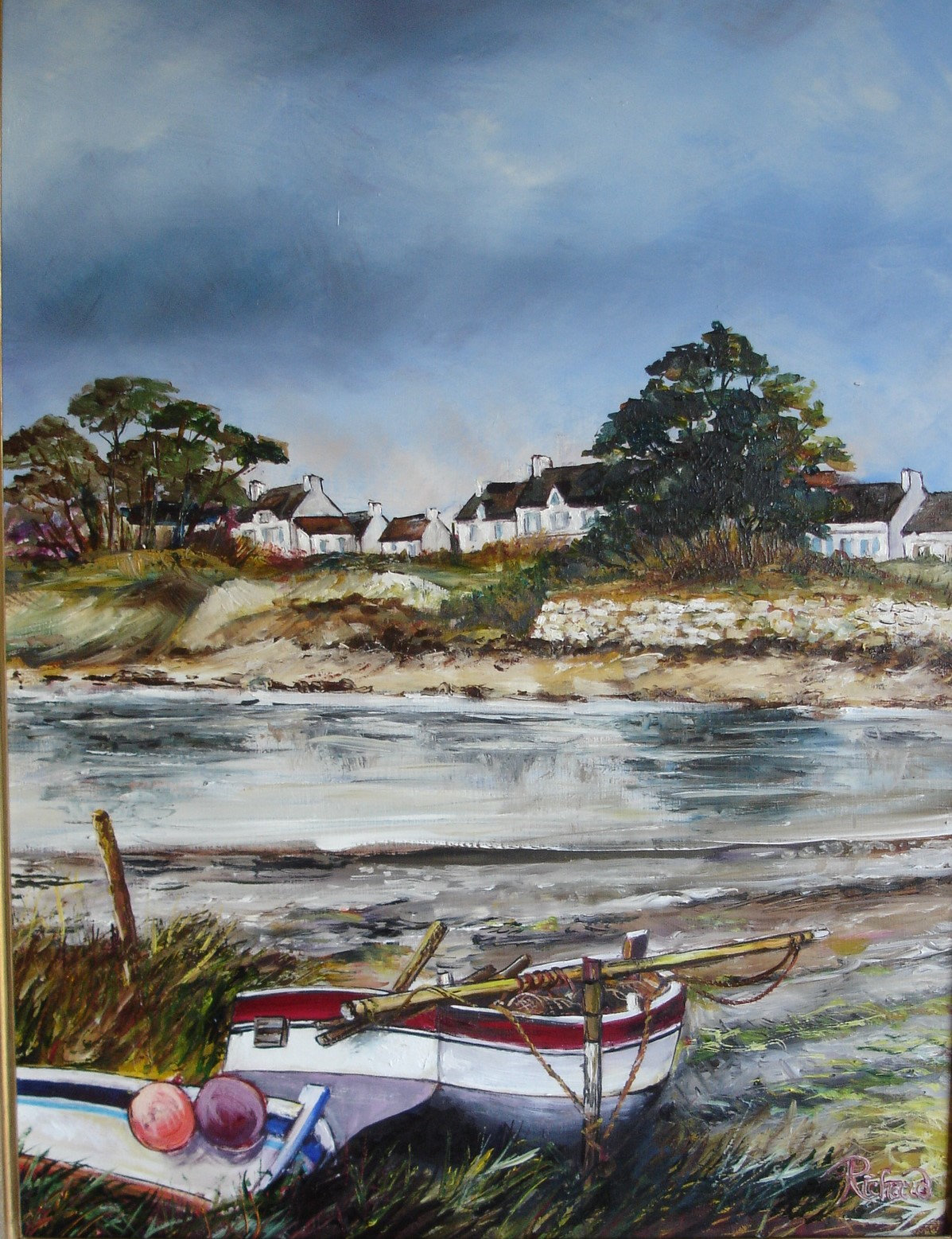 Venons au premier plan, introduit par les marges laissées par la marée descendante, lisières de débris et d’algues brunes, vertes et jaunes. Le point d’orgue de la scène est ici échoué dans la prairie de salicornes et d’ajoncs. Verts acidulés, jaunes clairs et carmin. Une barque à demi couchée, adossée à un poteau, tel qu’on en voit au mouillage. Coque ventrue, corps blanc et liserés rouges, fond sali de la teinte délavée par le sel de la mer. Le gréement est couché ; les cordages et les bouts pendent le long du mât et de la coque. Dans le bateau, des paniers et des nasses des flotteurs et des fanions pour les filets de pêche, à peine esquissés.