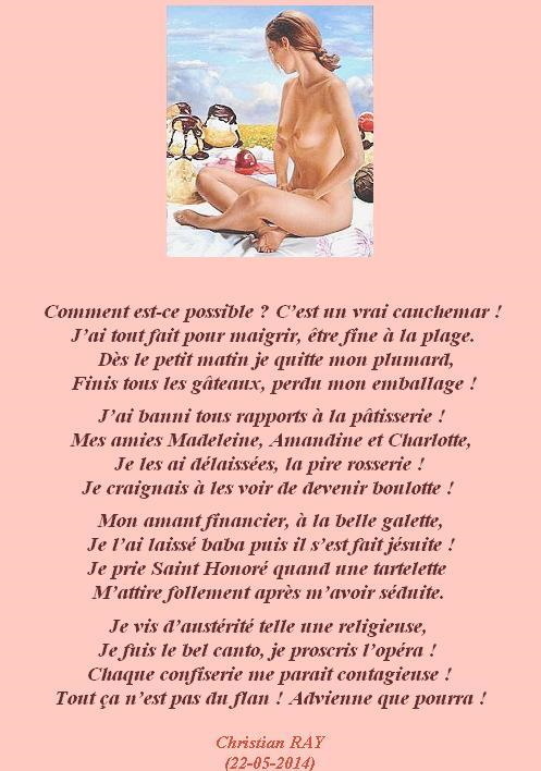 » L »ABSTINENTE « Accueil › Vos poèmes ***UN SEUL PAR JOUR*** Les « poèmes » érotiques descriptifs ne sont pas les bienvenus... Ce sujet contient 3 réponses, 4 participants et a été mis à jour pour la dernière fois par TIZI MOHAMED, le 05-06-2025 16:06. Créateur Sujet 5 juin 2025 à 16h06 #2720564 Mascotte d'Oasis christian Sujet: 6554Réponses: 13392 CLIC GAUCHE SUR L’IMAGE POUR AGRANDIR ET LIRE ou CLIC DROIT et choisir « Agrandir l’image » [url=https://zupimages.net/viewer.php?id=25/23/52sq.jpg][/url] Christian RAY avec Michel Drucker et Patrice Laffont Créateur Sujet Vous lisez 2 fils de discussion Auteur Réponses 5 juin 2025 à 15h38 #3570865 SybillaMaître des clés Sujet: 5464Réponses: 79667 Bonjour Cher Ami poète Christian, Elle est très bien comme elle est ! Veut elle devenir un squelette ? Ahh la mode des anorexiques… c’est ridicule ! Merci pour le sourire avec ta belle poésie humoristique ! Belle journée Cher Ami poète Christian ! Toutes mes amitiés Sybilla Le r?ve est le poumon de ma vie (Citation de Sybilla) 5 juin 2025 à 16h02 #3570878 Fran?ois Sujet: 300Réponses: 49951 Bonsoir Chris, très belle amusette poétique, le corps a aussi besoin de sucre Amitiés La po?sie, c'est comme la cuisine, le mot faitout 00063312-1 5 juin 2025 à 16h06 #3570882 Mascotte d'Oasis TIZI MOHAMED Sujet: 1702Réponses: 25075 elle veut être manche à balai et vivre dans un somptueux palais https://www.edilivre.com/peregrinations-29f53ef39f.html/ https://www.edilivre.com/le-spleen-de-la-logique-de-l-absurde-2c490d0b23.html/ Auteur Réponses Vous lisez 2 fils de discussion Vous devez être connecté pour répondre à ce sujet. Connexion Identifiant: Mot de passe: Rester connecté Connexion Log in / Register