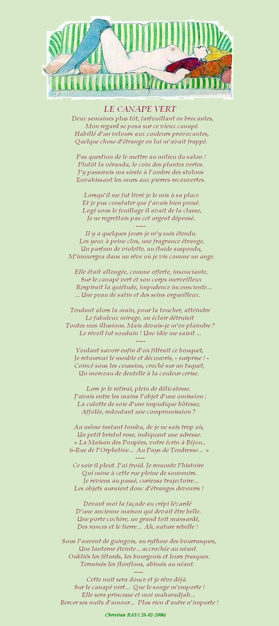 » LE CANAPE VERT « Accueil › Vos poèmes ***UN SEUL PAR JOUR*** Les « poèmes » érotiques descriptifs ne sont pas les bienvenus... Ce sujet contient 2 réponses, 3 participants et a été mis à jour pour la dernière fois par Sybilla, le 15-05-2024 00:01. Créateur Sujet 15 mai 2024 à 0h01 #2711696 Mascotte d'Oasis christian Sujet: 6554Réponses: 13392 [url=https://zupimages.net/viewer.php?id=24/19/ao9l.jpg][/url] Christian RAY avec Michel Drucker et Patrice Laffont Créateur Sujet Vous lisez 1 fil de discussion Auteur Réponses 12 mai 2024 à 15h08 #3513107 Fran?ois Sujet: 300Réponses: 49951 Bonsoir Chris, surprenante histoire que conte la plume Amitiés La po?sie, c'est comme la cuisine, le mot faitout 00063312-1 15 mai 2024 à 0h01 #3513385 SybillaMaître des clés Sujet: 5464Réponses: 79667 Bonsoir cher ami poète ChrisR, Magnifique poésie que je viens de relire en partage ! Belle soirée cher ami poète ChrisR ! Toutes mes amitiés Sybilla Le r?ve est le poumon de ma vie (Citation de Sybilla) Auteur Réponses Vous lisez 1 fil de discussion Vous devez être connecté pour répondre à ce sujet. Connexion Identifiant: Mot de passe: Rester connecté Connexion Log in / Register