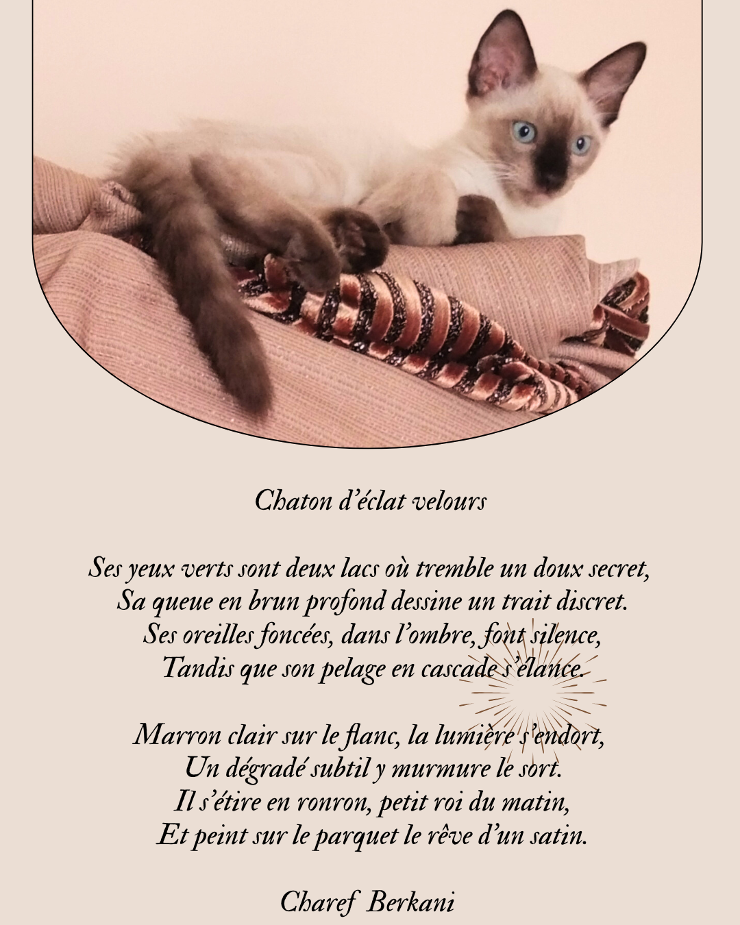 Le chaton était d’une beauté étrange, presque dessinée. Sa queue et ses oreilles étaient d’un brun profond, une encre tombée sur la soie. Mais son corps, lui, portait un dégradé lumineux : du marron clair caressé par le jour, qui s’estompait lentement vers les pattes, comme si l’aube avait glissé sur lui sans jamais s’effacer.