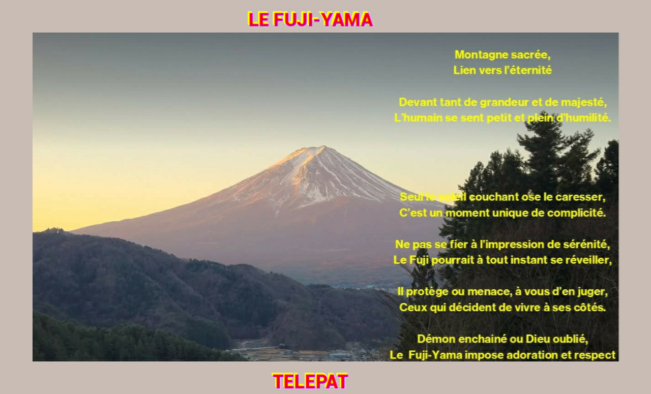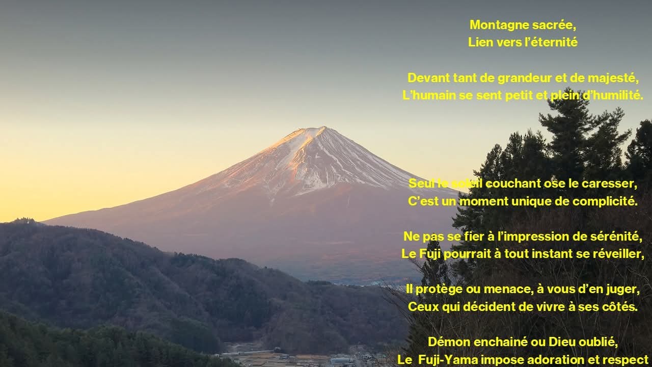 Moi qui aime tout se qui touche au Japon, en particulier le cinéma et l’art traditionnel de ce pays, ce mont Fuji est un bien beau symbole, de quiétude et paradoxalement, d’incertitude face aux tremblements de terre coutumier de l’île et sa région, mais, cela n’empêche le plaisir des yeux et ce poème en démontre l’intérêt…