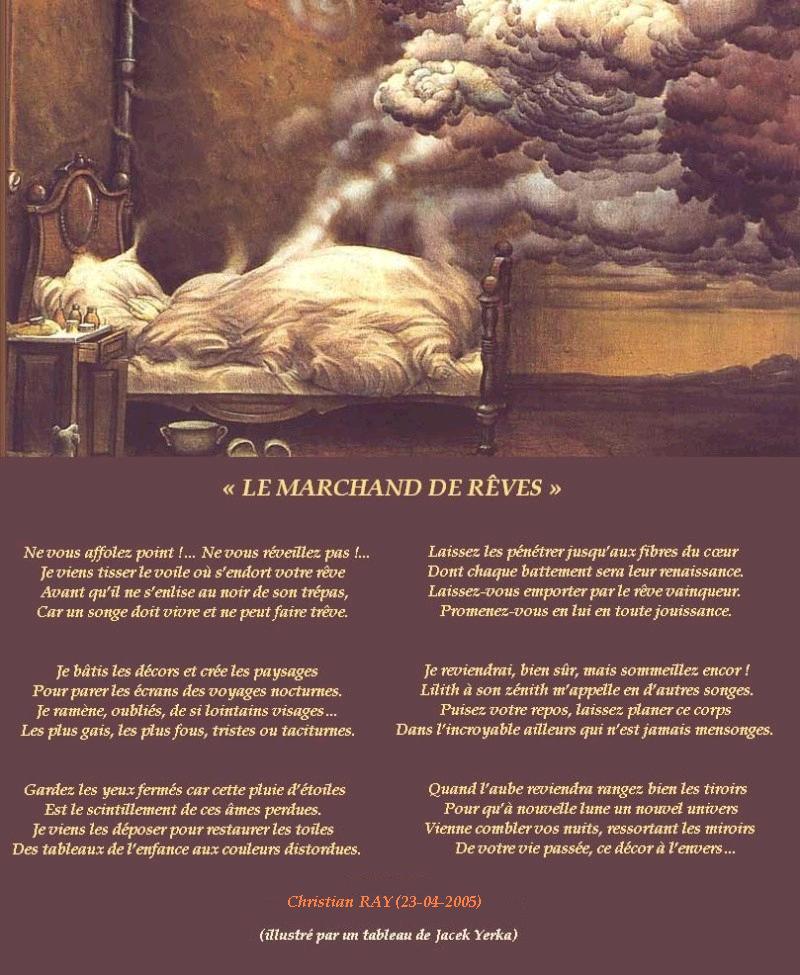 » LE MARCHAND DE RÊVES « Accueil › Vos poèmes ***UN SEUL PAR JOUR*** Les « poèmes » érotiques descriptifs ne sont pas les bienvenus... Ce sujet contient 4 réponses, 6 participants et a été mis à jour pour la dernière fois par Sybilla, le 28-11-2025 20:43. Créateur Sujet 28 novembre 2025 à 20h43 #2724133 Mascotte d'Oasis christian Sujet: 6554Réponses: 13392 Christian RAY avec Michel Drucker et Patrice Laffont Créateur Sujet Vous lisez 3 fils de discussion Auteur Réponses 28 novembre 2025 à 6h08 #3595246 Mascotte d'Oasis Marie-Thérèse H. Sujet: 1727Réponses: 26263 Bonjour Christ Ray Un beau poème sur l’art de sommeiller grâce à ce Marchand de rêves Bonne journée amitiés bises https://www.youtube.com/channel/UCpZt6YdLXLyMVA004T1KoiQ ... 28 novembre 2025 à 6h15 #3595247 GH Khaled Sujet: 122Réponses: 393 Un marchand qui nous vend déjà ce qui nous manque est le bienvenu Surtout que ne rêves débordent et ne se réalisent que rarement Tres joli Un peu de science éloigne de Dieu mais beaucoup y rapproche. 28 novembre 2025 à 19h26 #3595314 Fran?ois Sujet: 300Réponses: 49951 Bonsoir Chris, magnifique poème Amitiés La po?sie, c'est comme la cuisine, le mot faitout 00063312-1 28 novembre 2025 à 20h43 #3595332 SybillaMaître des clés Sujet: 5464Réponses: 79667 Bonsoir Cher Ami poète Christian, Magnifique poésie en partage ! Belle soirée Cher Ami poète Christian ! Toutes mes amitiés Sybilla Le r?ve est le poumon de ma vie (Citation de Sybilla) Auteur Réponses Vous lisez 3 fils de discussion Vous devez être connecté pour répondre à ce sujet. Connexion Identifiant: Mot de passe: Rester connecté Connexion Log in / Register