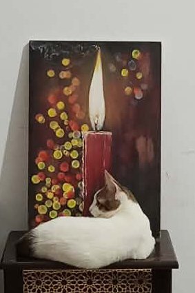 Je te regarde brûler, ma douce lumière, et j’entends dans ta flamme le murmure qu’elle aurait aimé me confier. Ce n’est pas ma voix qui parle vraiment, c’est la sienne, cachée derrière mes mots. Elle dirait que la nuit la touche là où personne ne voit, avec cette tendresse qu’elle refuse d’avouer en plein jour.Le chat repose contre toi comme elle aurait voulu reposer contre moi : tranquille, offerte, silencieuse, enveloppée d’une chaleur qu’elle cherche depuis trop longtemps. Dans le velours de son pelage, je sens son désir discret, ce désir qu’elle porte, elle, sans jamais oser le nommer.
