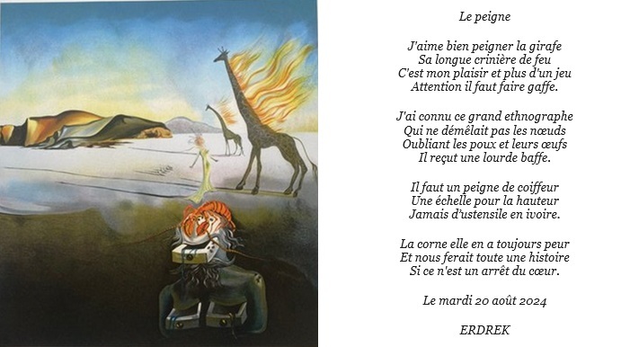 Le peigne Accueil › Vos poèmes ***UN SEUL PAR JOUR*** Les « poèmes » érotiques descriptifs ne sont pas les bienvenus... Ce sujet contient 8 réponses, 7 participants et a été mis à jour pour la dernière fois par Erdrek, le 21-08-2024 07:23. Créateur Sujet 21 août 2024 à 7h23 #2714284 Erdrek Sujet: 285Réponses: 2546 : "?tre vrai, peu le peuvent" F. Nietzsche Créateur Sujet Vous lisez 7 fils de discussion Auteur Réponses 20 août 2024 à 8h32 #3529482 Mascotte d'Oasis islander Sujet: 2940Réponses: 34198 excellent et spirituel, moi je ne suis pas jaloux des girafes, merci du régal yann 20 août 2024 à 8h34 #3529483 M.Go Sujet: 129Réponses: 1032 Vous aimez bien couper les cheveux en quatre ! À nous de démêler le vrai du faux ! On ne va pas vous chercher des poux. J’image bien votre girafe ainsi peignée avec une belle raie au milieu. Mercy pour cette bonne humeur matinale. F?e Miltanya pour ceux qui le m?ritent ou Marquise ?lo?se pour les amateurs de jeux de r?les... Mercy avec un Y http://fee-milt... 20 août 2024 à 8h39 #3529485 poetal Sujet: 2500Réponses: 6013 [email]domi.gondrand@laposte.net[/email] 20 août 2024 à 10h14 #3529502 Erdrek Sujet: 285Réponses: 2546 Merci à vous pour vos retours Shyria Obofix Isalnder Miltanya Poetal ¨Pierre je ne connais pas cette acception coquine Bien à vous et bonne journée "?tre vrai, peu le peuvent" F. Nietzsche 20 août 2024 à 13h05 #3529531 Mascotte d'Oasis Ancielo Sujet: 847Réponses: 8953 Drole et étonnant. J’aime. Du surréalisme du grand maitre Dali. 20 août 2024 à 13h11 #3529532 Plume de diamant★★★★★★ cyrael Sujet: 4849Réponses: 48873 WOW Quelle belle idée peigner girafe Dali serait ravi , merci pour ce magnifique hommage à l’artiste [url=https://zupimages.net/viewer.php?id=24/34/ar0u.jpg][/url] l'Amour rayonne quand l'Ame s'?l?ve, citation maryjo 20 août 2024 à 14h40 #3529539 SybillaMaître des clés Sujet: 5464Réponses: 79667 Bonsoir Cher Ami poète Erdrek, Superbe poésie pleine d’humour qui fait rire ! Belle soirée Cher Ami poète Erdrek ! Toutes mes amitiés Sybilla Le r?ve est le poumon de ma vie (Citation de Sybilla) 21 août 2024 à 7h23 #3529610 Erdrek Sujet: 285Réponses: 2546 Bonjour et merci à vous Encielo Cyrael doublement pour sa mise en page Sybilla Bien à vous "?tre vrai, peu le peuvent" F. Nietzsche Auteur Réponses Vous lisez 7 fils de discussion Vous devez être connecté pour répondre à ce sujet. Connexion Identifiant: Mot de passe: Rester connecté Connexion Log in / Register