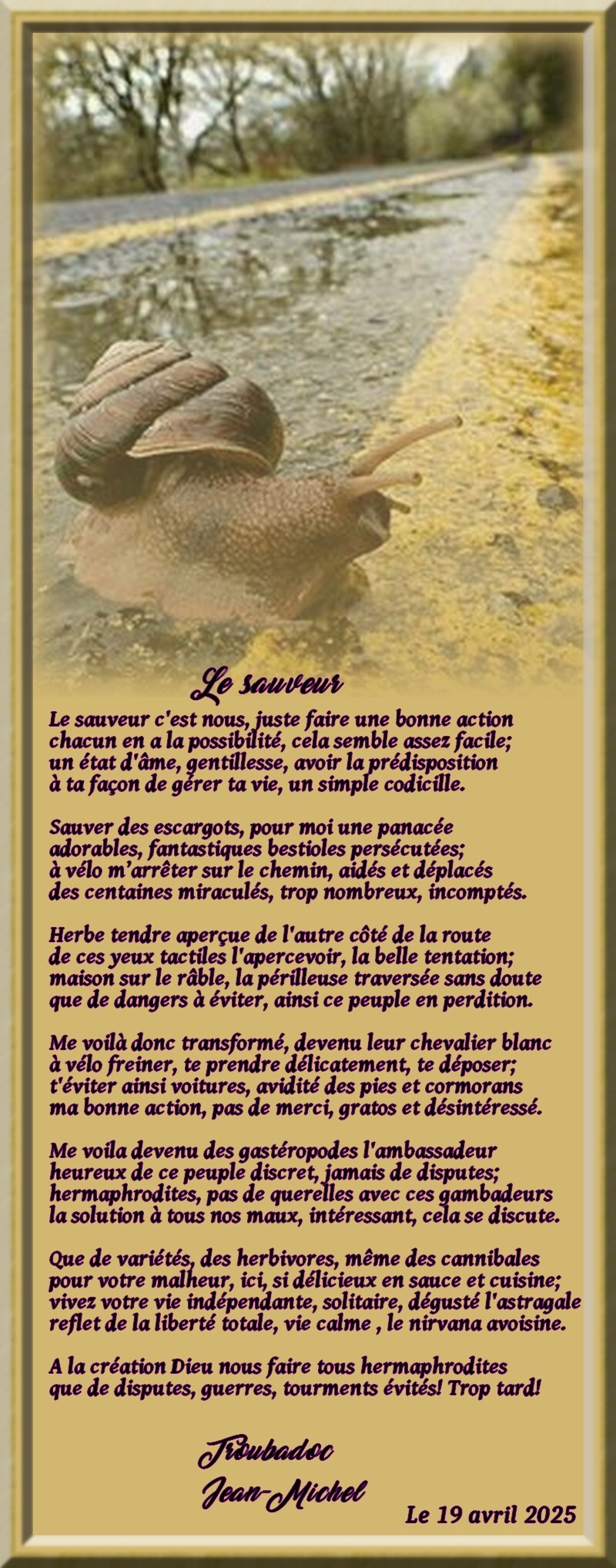 ma bonne action, pas de merci, gratos et désintéressé.Me voila devenu des gastéropodes l’ambassadeur